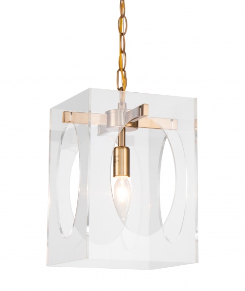 A SQUARE CLEAR ACRYLIC SINGLE PENDANT LIGHT WITH AN ANTIQUE BRASS METAL FRAME