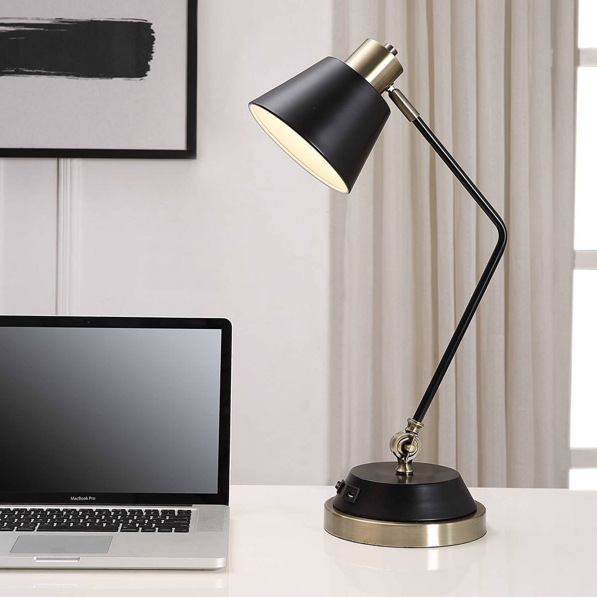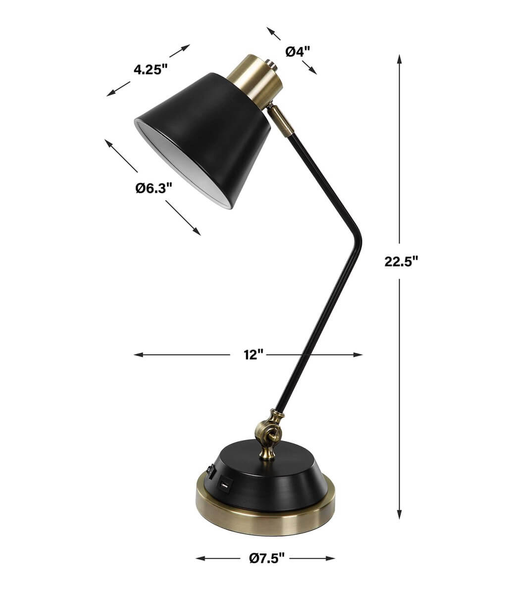 Not only functional, but this desk lamp will add a sense of style to your work area. Finished in an antique brass and black combination, this lamp is complete with a USB port and rocker switch. The metal shade pivots up and down to shine light where needed and the arm moves, allowing closer light to your tasks.