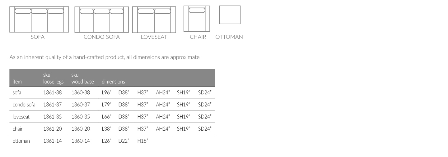 Available in fabric or leather. Available with loose legs or wood base. Accent pillows not included.