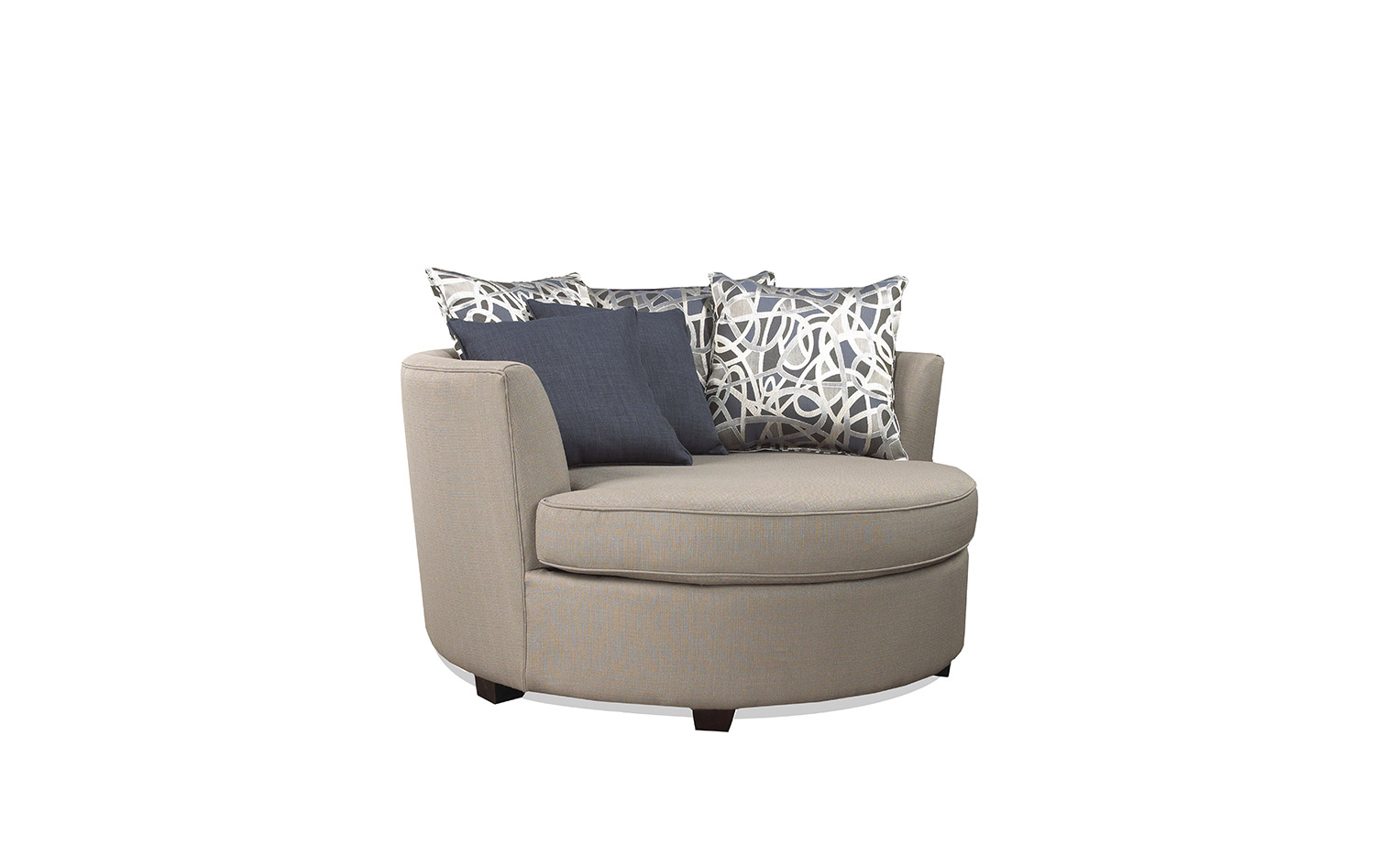 This circular chair will have you curled up in comfort surronded by a lavish sea of pillows. Eco-friendly construction. Certified sustainable, kiln-dried wood frame. Benchmade in Canada.