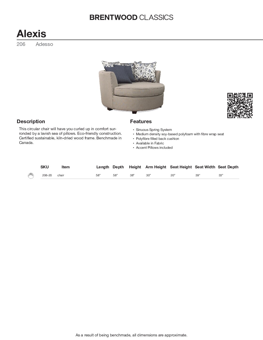 L58″ D58″ H38″ AH30″ SH20″ SD33″