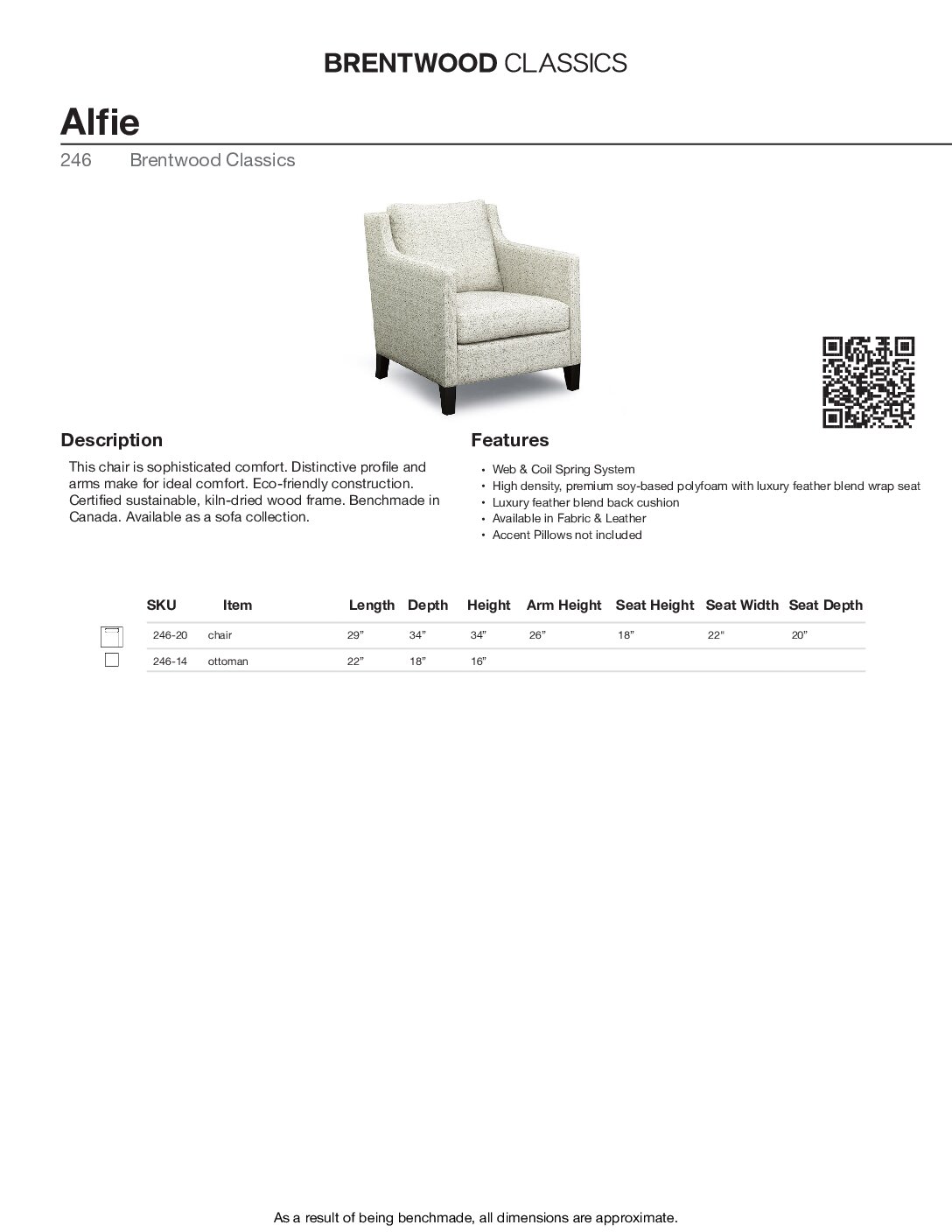 This chair is sophisticated comfort. Distinctive profile and arms make for ideal comfort. Eco-friendly construction. Certified sustainable, kiln-dried wood frame. Benchmade in Canada. Available as a sofa collection.