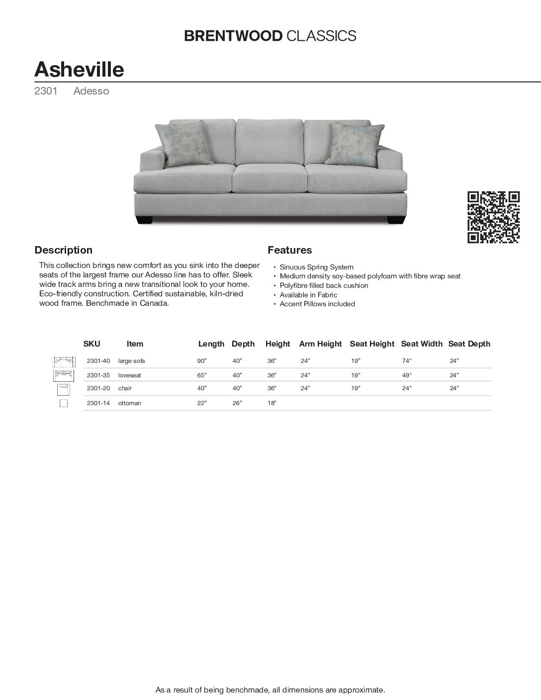 This collection brings new comfort as you sink into the deeper seats of the largest frame our Adesso line has to offer. Sleek wide track arms bring a new transitional look to your home. Eco-friendly construction. Certified sustainable, kiln-dried wood frame. Benchmade in Canada.