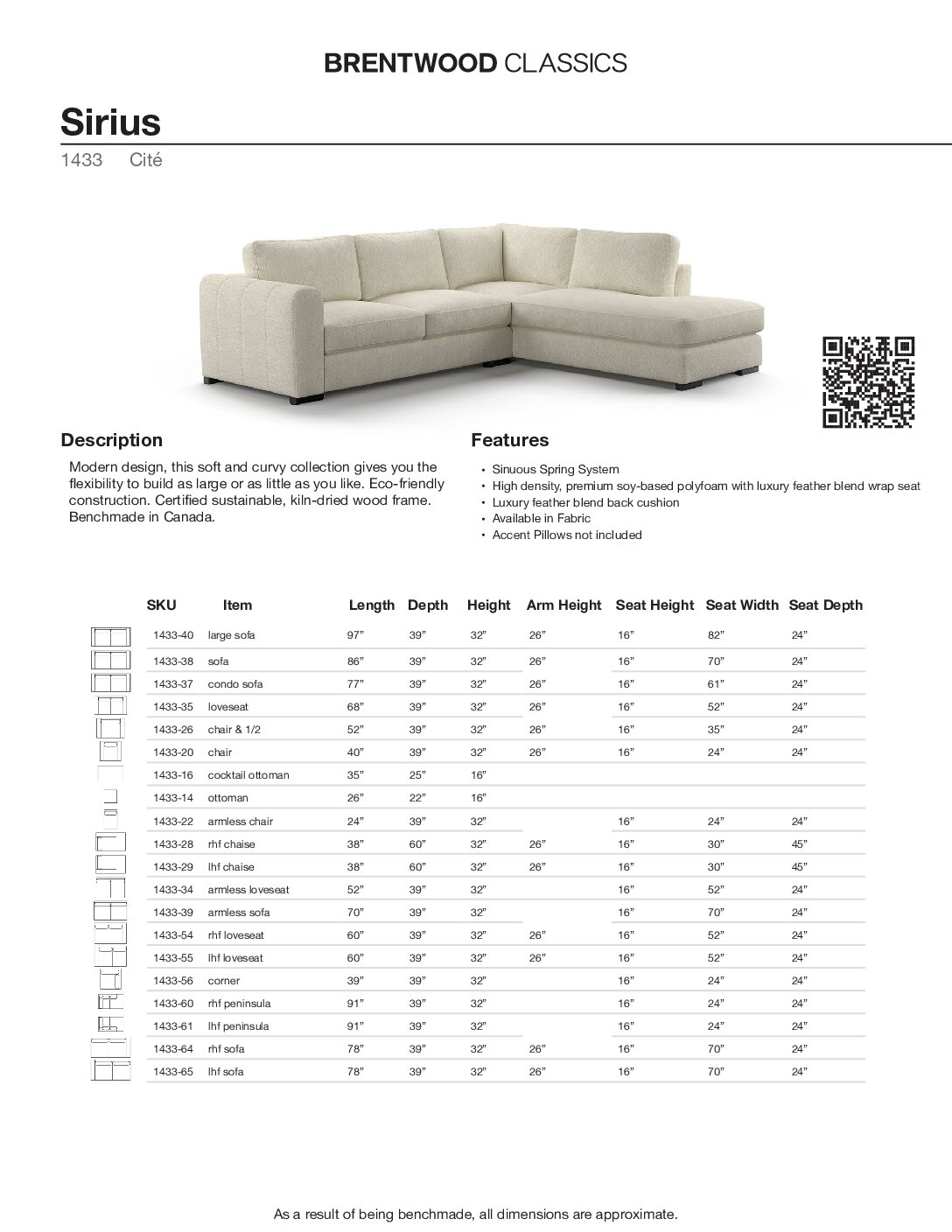 Modern design, this soft and curvy collection gives you the flexibility to build as large or as little as you like. Eco-friendly construction. Certified sustainable, kiln-dried wood frame. Benchmade in Canada.