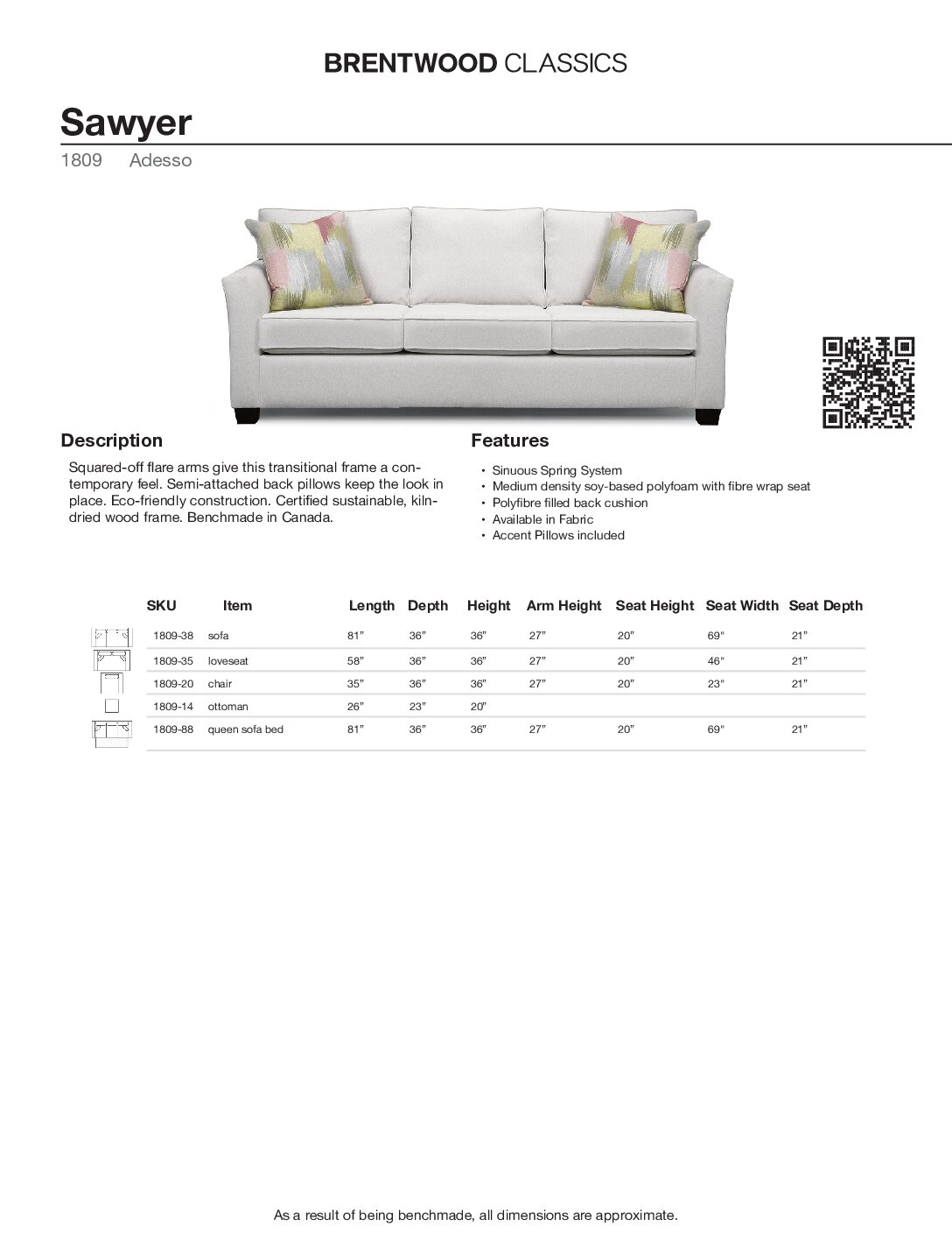 Squared-off flare arms give this transitional frame a contemporary feel. Semi-attached back pillows keep the look in place. Eco-friendly construction. Certified sustainable, kiln-dried wood frame. Benchmade in Canada.