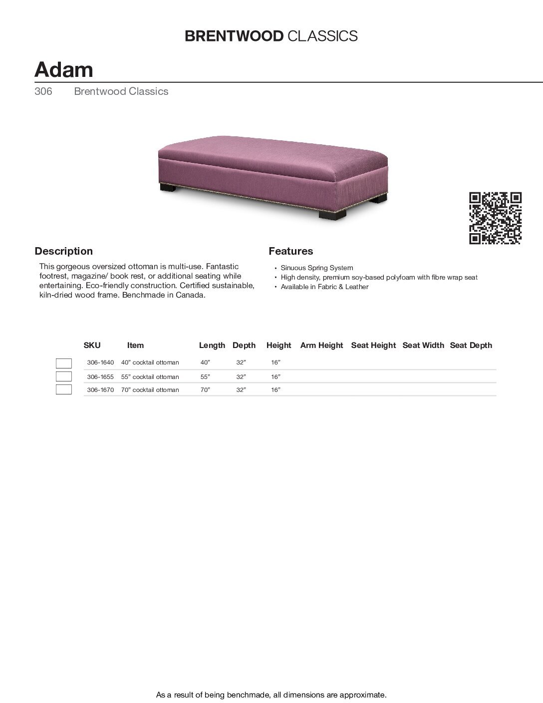 This gorgeous oversized ottoman is multi-use. Fantastic footrest, magazine/ book rest, or additional seating while entertaining. Eco-friendly construction. Certified sustainable, kiln-dried wood frame. Benchmade in Canada.