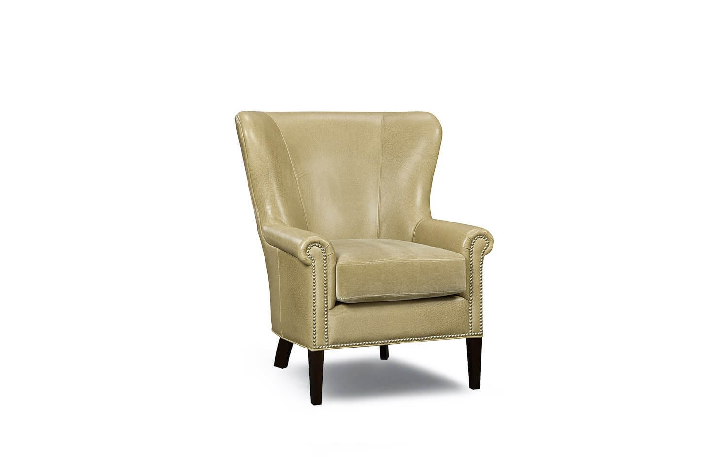Stately strength. A chair so comfortable you could curl up and read a book, while simultaneously powerful enough to sit in an office or den. This barrel-backed wing chair flanked by slim rolled arms. Nailhead trim accents the base and arm detailing. Eco-friendly construction. Certified sustainable, kiln-dried wood frame. Benchmade in Canada.