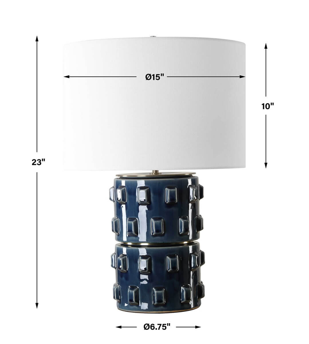 With its captivating round design and rich blue hue, this ceramic table lamp adds a pop of color and personality to any room. The square raised features on the body lend a unique texture, creating visual interest and depth. A thin, antique brass, metal band separates the lamp's body. The round shade is a white linen fabric.