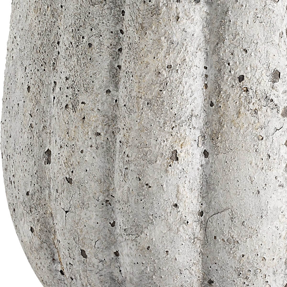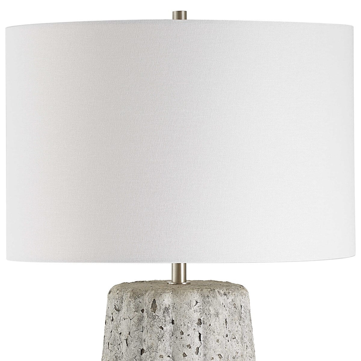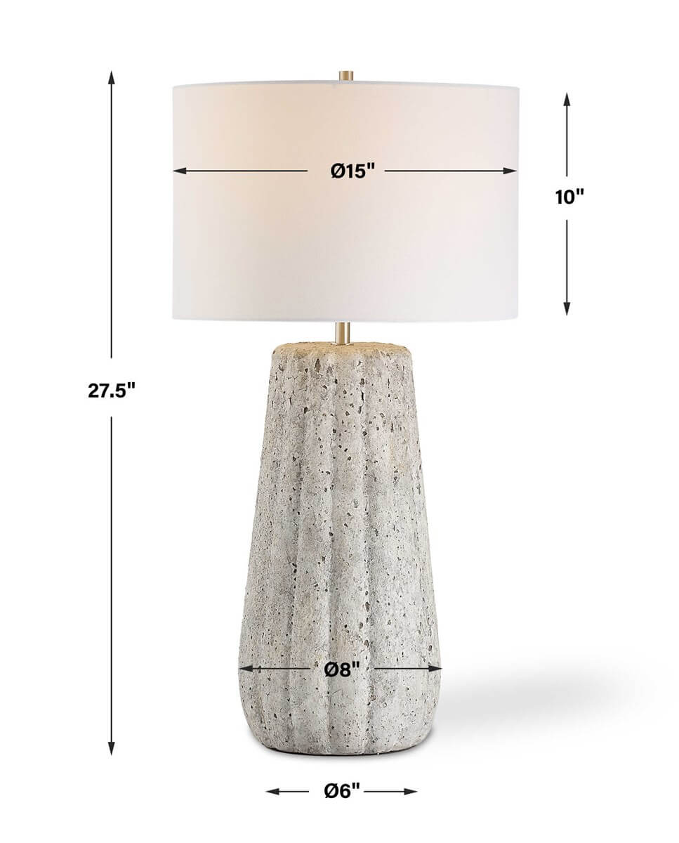 The soft movement of this ceramic lamp's design is enhanced by a weathered stone finish, creating an old-world style. Brushed nickel accents complement the distressed finish. A round hardback shade in off white linen completes the look.