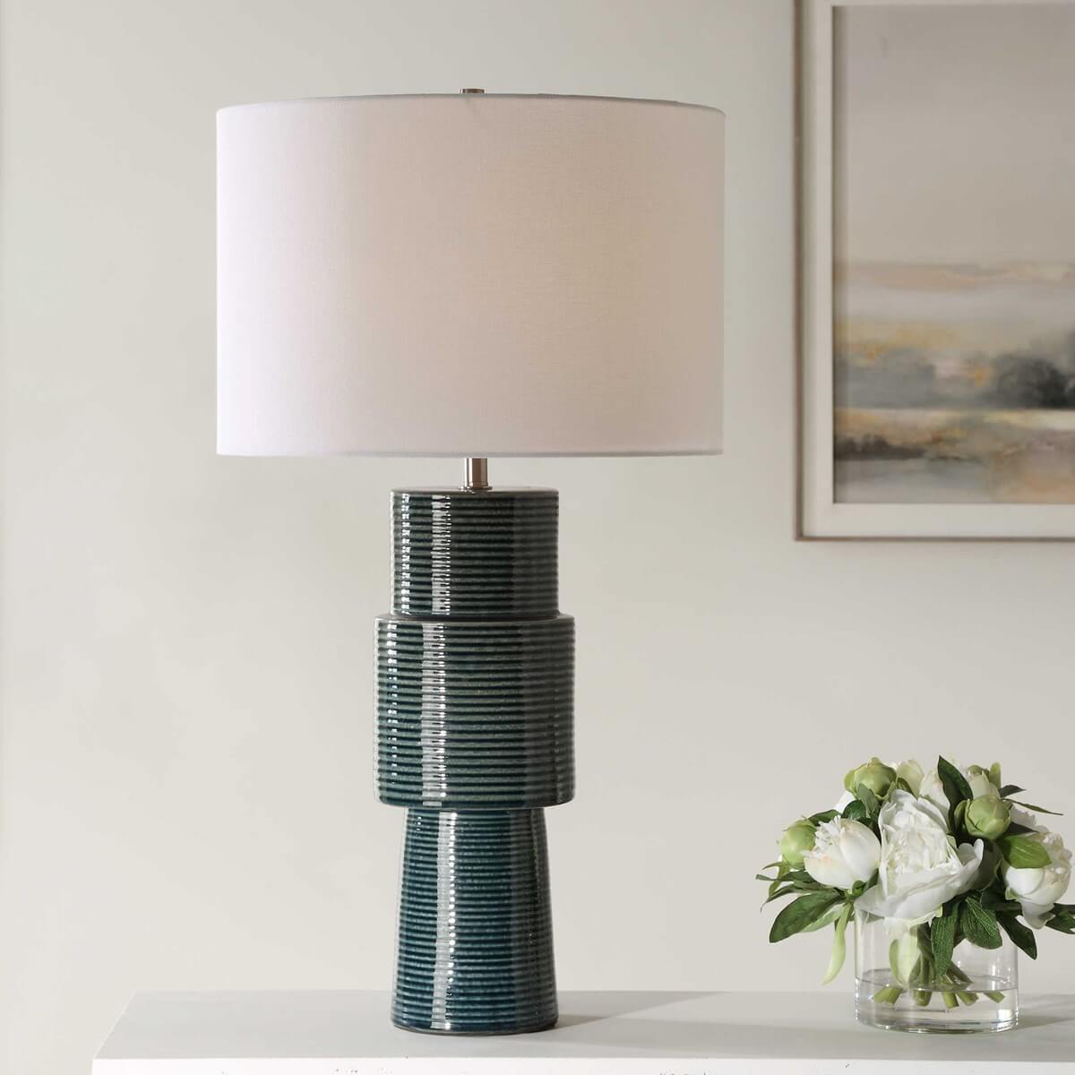 This teal ceramic table lamp features a stacked round body supported by a slightly tapered base and brushed nickel accents. The ribbed texture adds dimension to the rich finish and a round hardback shade in white linen completes the look.