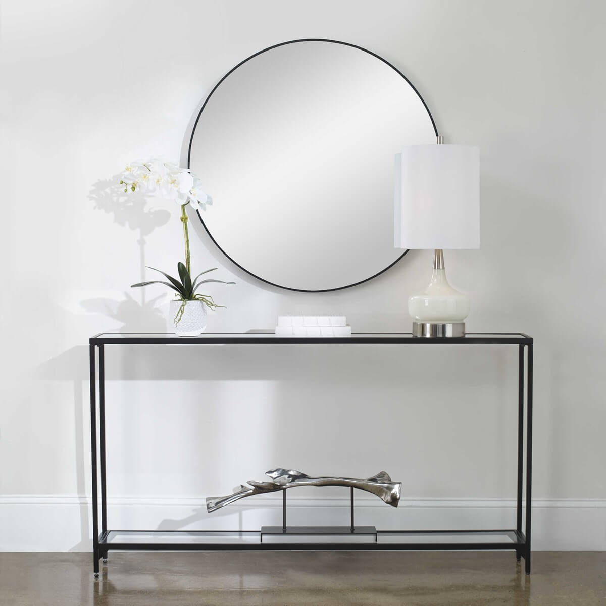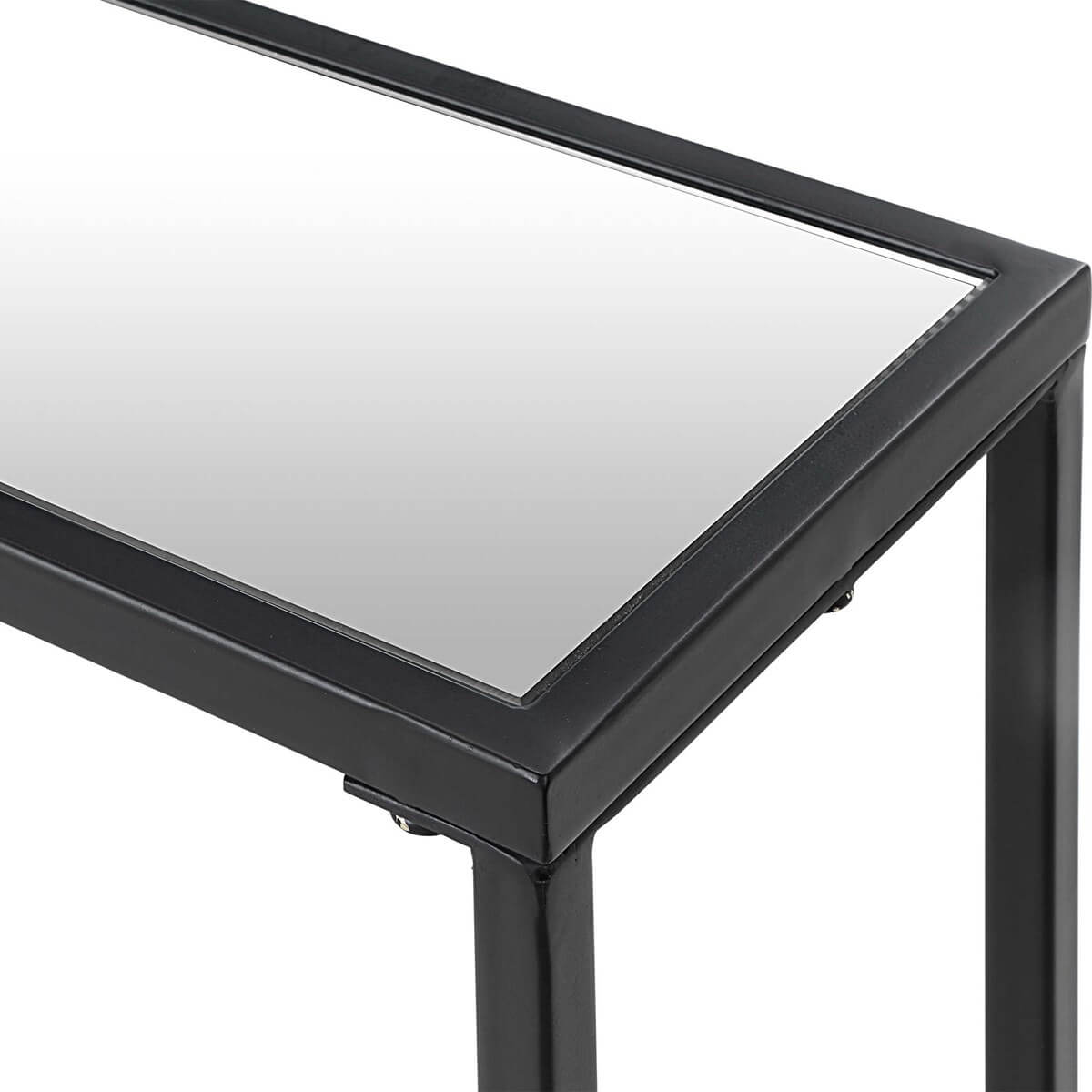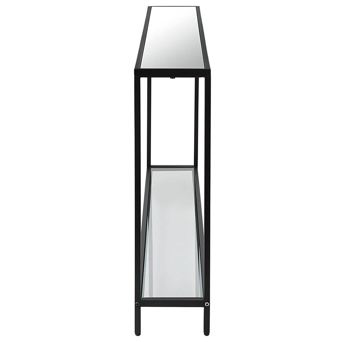 The narrow, simple profile of this iron console table will make it perfect for a foyer or any limited space. The clean lines and modern design are accented in a satin black finish. The top shelf is mirrored, with tempered glass on the lower shelf. Anti tip hardware included.