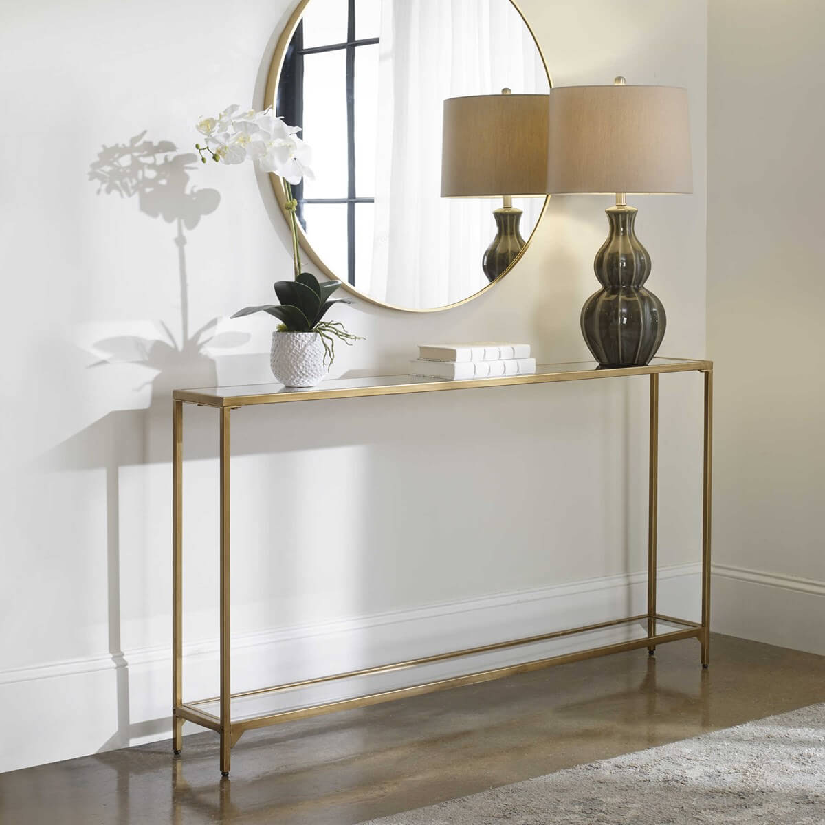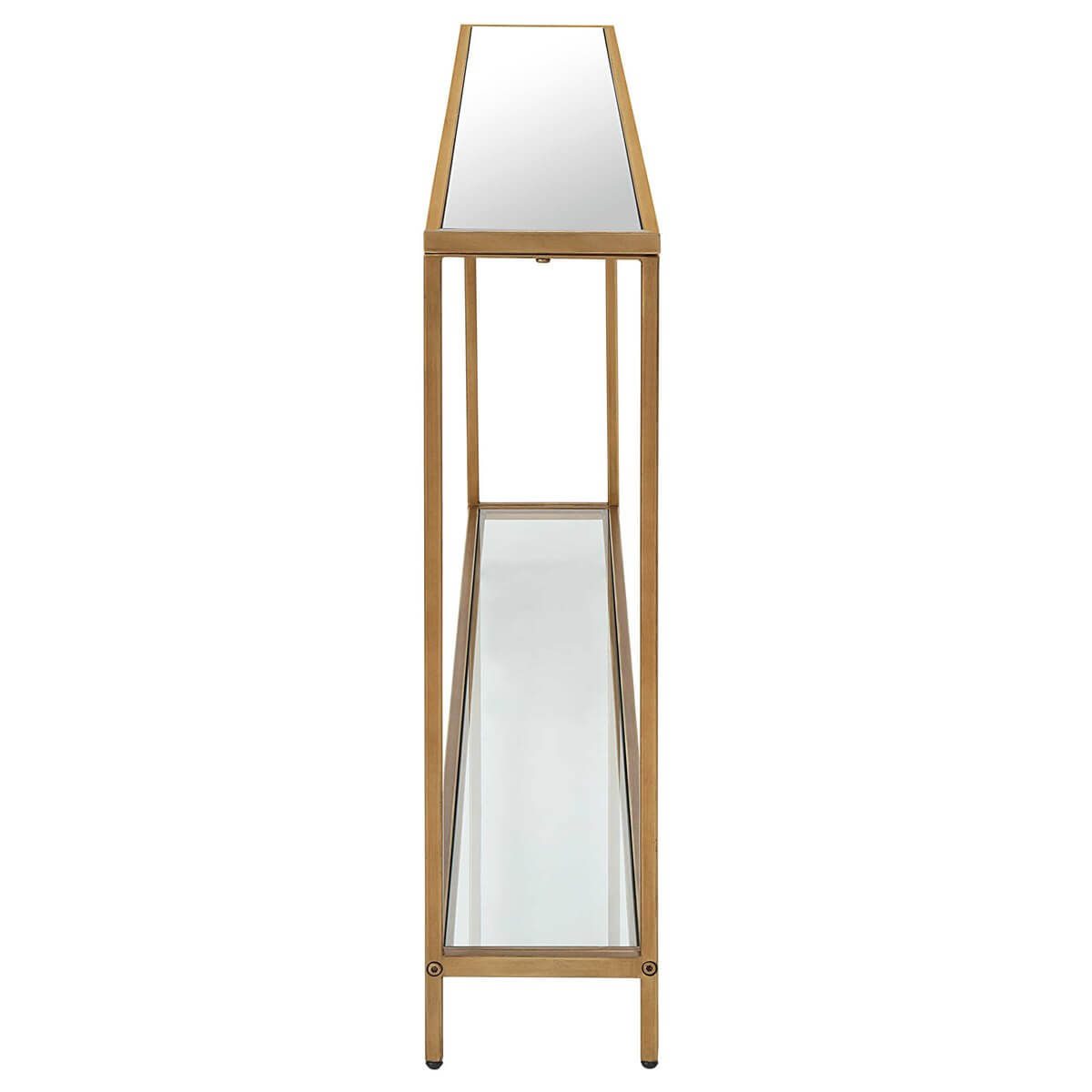 The narrow, simple profile of this iron console table will make it perfect for a foyer or any limited space. The clean lines and modern design are accented in a warm gold finish. The top shelf is mirrored, with tempered glass on the lower shelf. Anti tip hardware included.