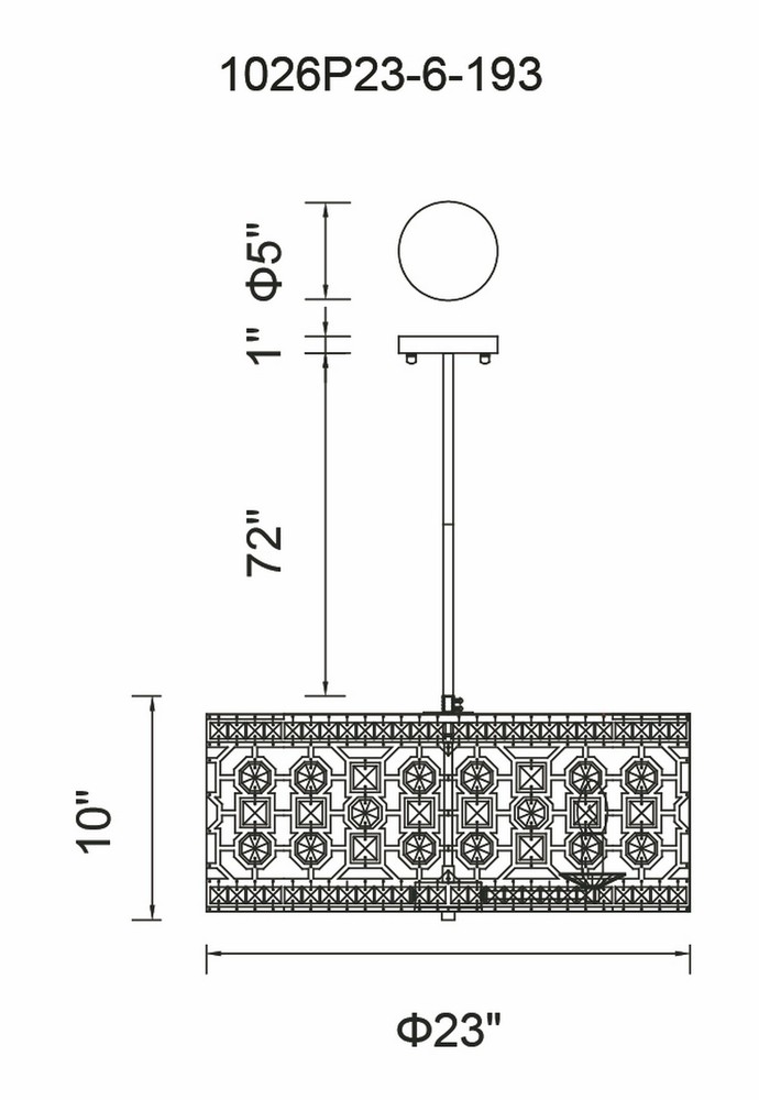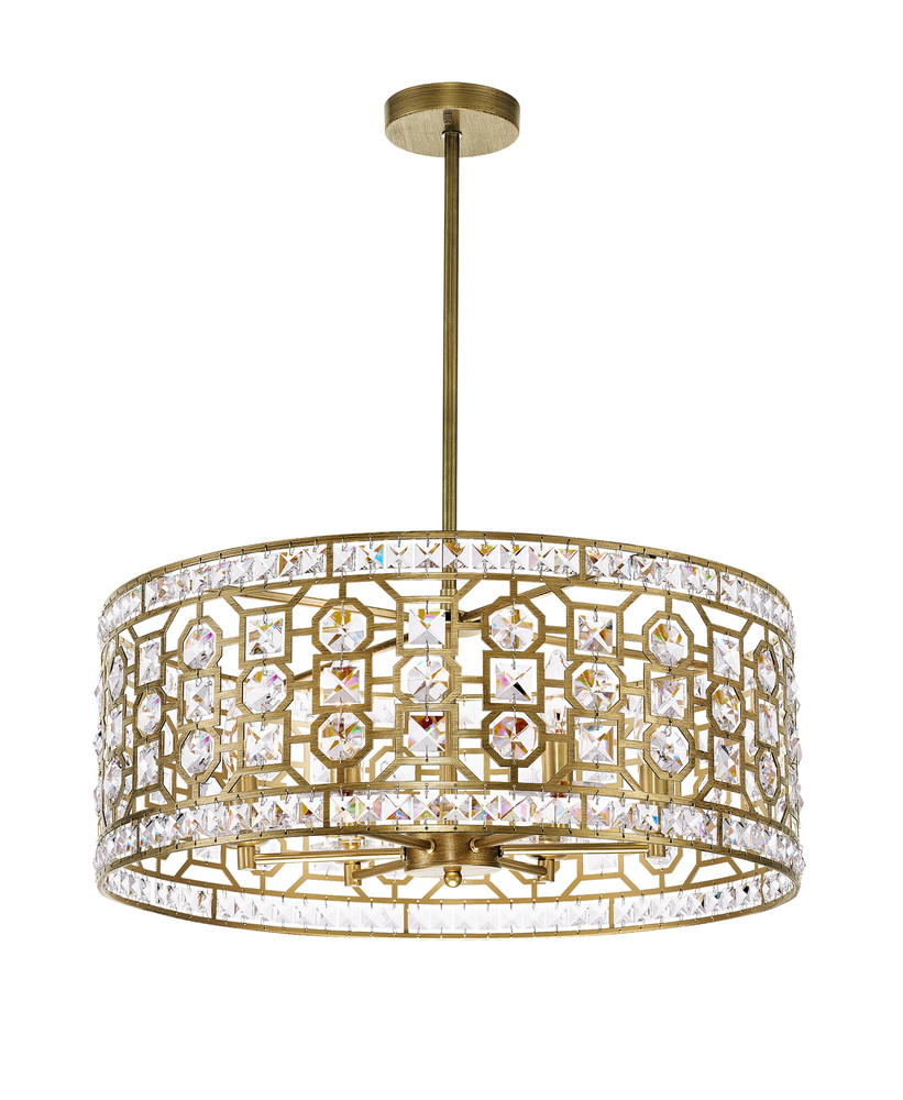 Ready to complete any setting beautifully, the Belinda 6-Light Chandelier displays an eye-catching glamour with its champagne finish and glittering clear crystal prisms. This brilliant light source features a 23-inch laser-cut metal drum shade with a geometric pattern dotted by clear crystals. Concealed inside the shade are six candelabra bulbs ready to bring a glittering glow to your luxurious bedroom or dining room.
