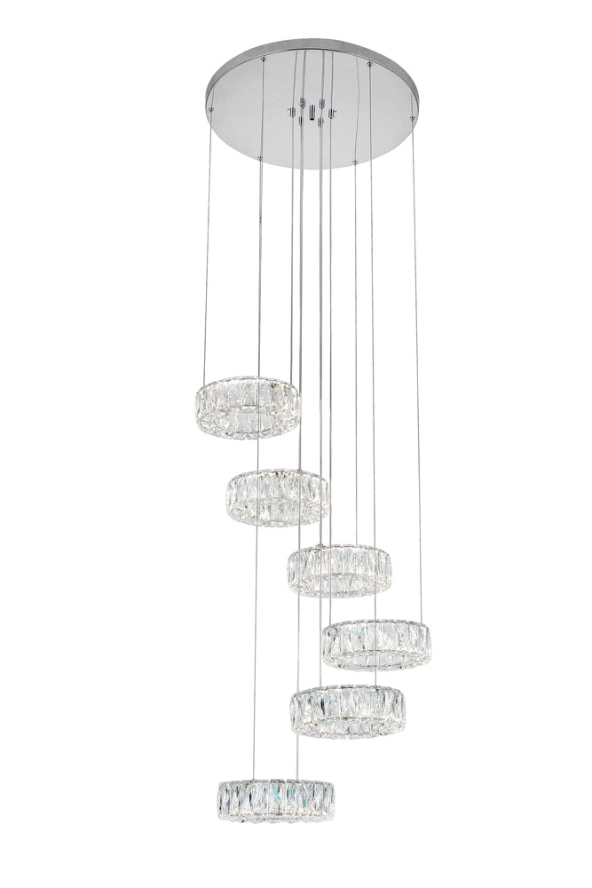 Soften the hard surfaces and edges in your home with the presence of this Madeline 6-Ring LED Chandelier. Ready to balance angles are xix 10-inch by 3-inch crystal rings that cascade from a round chrome canopy. Position this in the stairwell, foyer, in your high-ceiling living room, or anywhere that needs a shot of glamour.