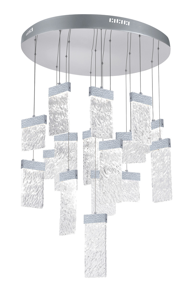 Edgy but with a soft and feminine essence, the Carolina Pewter 32-in LED Chandelier is ready to give your home an elegant finish without making your interiors look and feel stuffy. This modern down chandelier features a round canopy holding 16 textured clear glass panels with integrated LED chips. This light source easily adds contrast, layer, texture, and style to wherever it is placed.