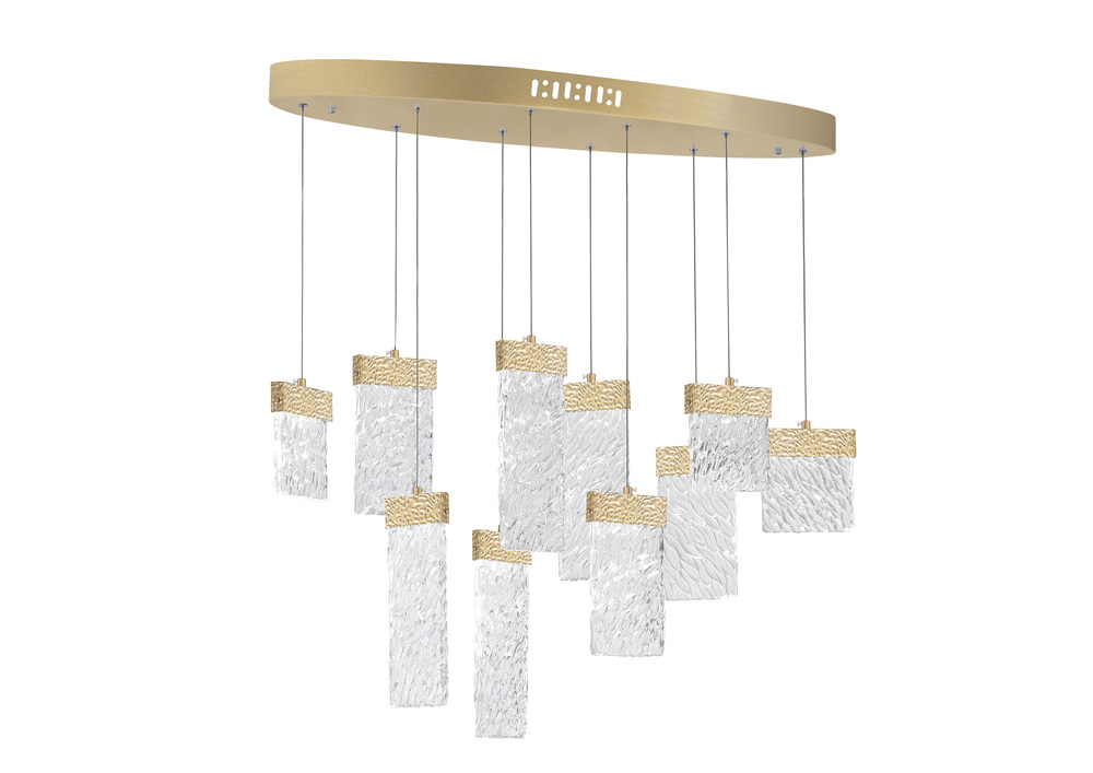 Add scale and a sense of grandeur to your space with the Carolina Gold Leaf 40-inch LED Chandelier. This show-stopping down chandelier features an oval canopy in gold leaf finish holding ten clear glass panels with integrated LED. The floating quadrilateral panels of light diffuse a glow of luxurious beauty into the room. This is the perfect light source when you want to add a touch of opulence to your space while maintaining its airy and inviting vibe.