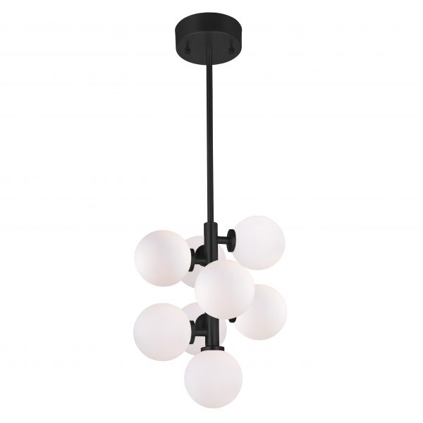 Sure to be a stand-out feature in your modern dining room or kitchen, the Arya 8-Light Pendant in Black finish will radiate a chic style to your space. This beautiful pendant light measures 12 inches in diameter and features eight frosted glass globes affixed to a luxe metal frame. Dimmable and for use with LED bulbs, this lighting option will prettify and illuminate your space for years.
