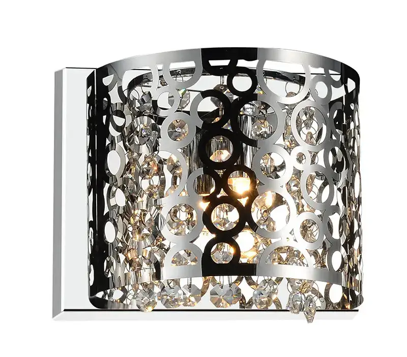 Character and style converge in this captivating wall lamp. The Bubbles 1-Light Wall Sconce features a half-circle metal shade with bubble cut-out pattern. It conceals a single bulb embellished with strands of round crystals that refract light in a sparkling way. This bathroom sconce will easily make your powder room look special and feel luxurious.