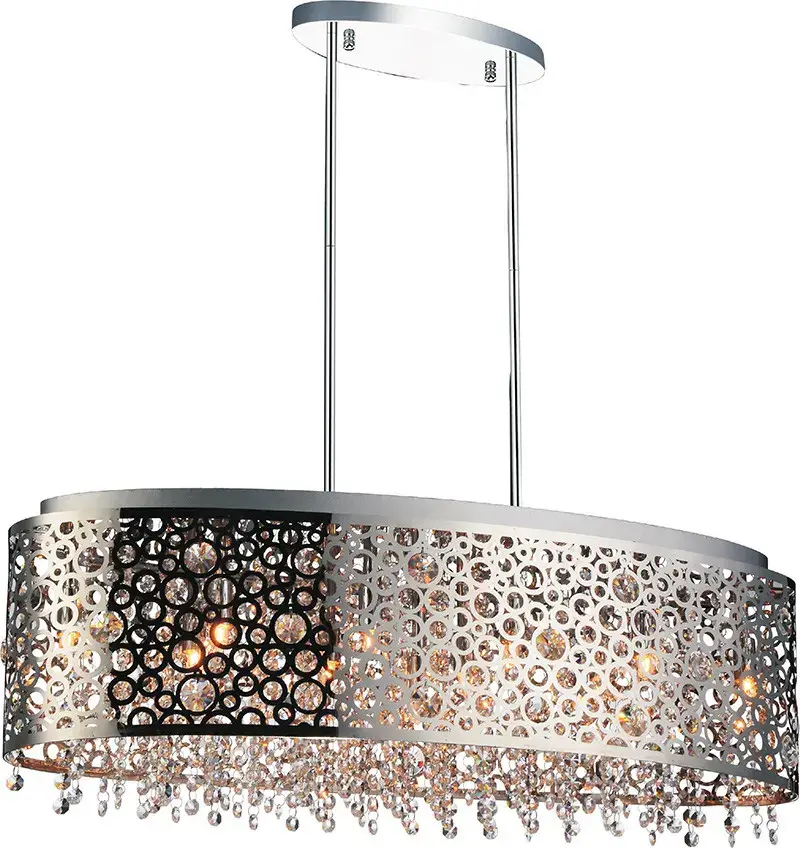 The Bubbles 11-Light Chandelier delivers incredible sophistication with its texture, form, and pattern. This light fixture has an oval drum shade made from laser-cut metal showcasing bubble-like cuts. Dangling from the inside of the shade are crystal strands that sparkle alongside eleven bulbs. This chrome chandelier is sleek and stylish and ready to bring in that added wow factor to your interiors.
