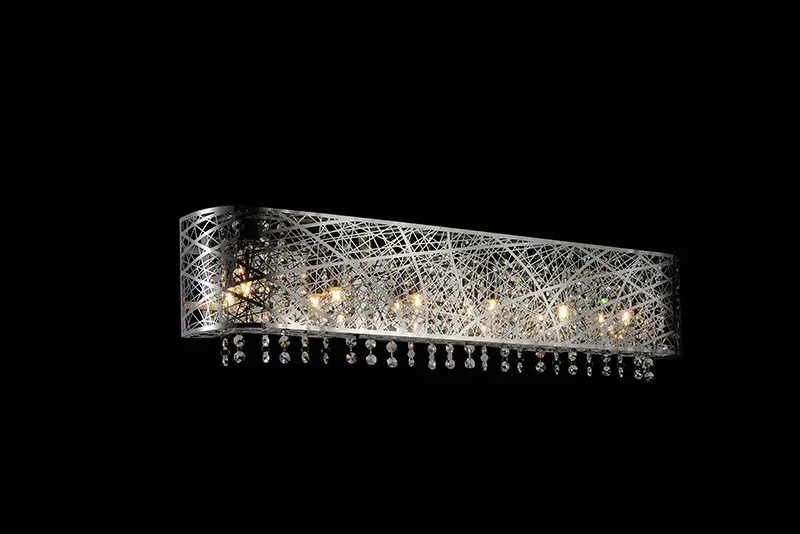 The Eternity 6-Light Wall Sconce is a dazzling modern sconce that will add tons of style and personality to your bathroom. It features a polished chrome shade with laser-cut pattern and strands of clear crystals dripping from the inside. With six G9 bi-pin bulbs that will provide ample lighting, this wall-mounted vanity light will bring a sophisticated touch to your master bath or halfway bath.