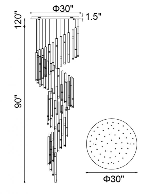 The showstopping Flute 54-Light Chandelier is not just a light fixture but a home decor statement piece. Suspending from a 30-inch black round canopy are 54 bulbs ready to give a luxurious glow over your hallway, stairwell, or living room. This contemporary chandelier is set to give an extra touch of style to your space given its sleek spiral silhouette.