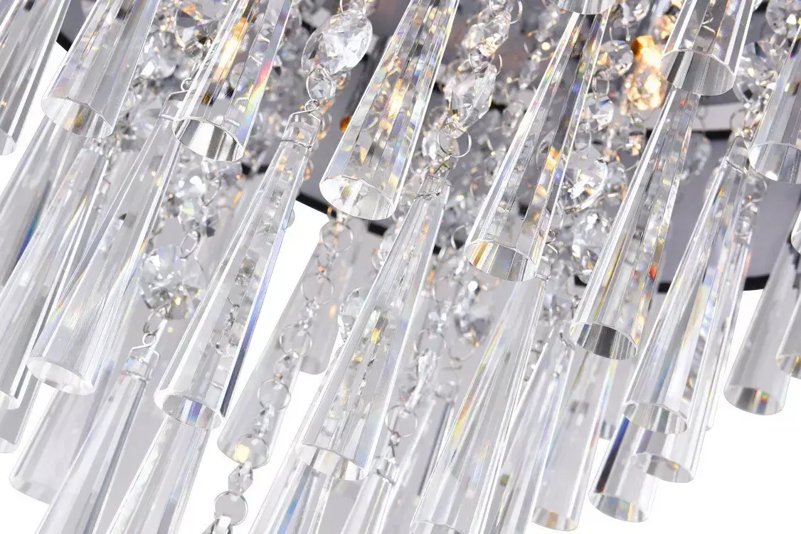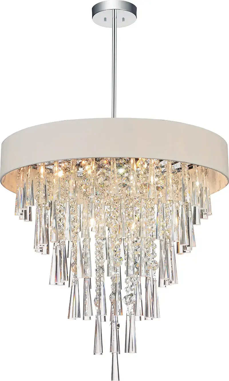 Bling it on! The Franca 8-Light Chandelier features clear glass drops that offer undeniable brilliance. Crystal droplets are held in place by a 22-inch drum shade, in off white or black, connected to an adjustable chrome rod with chrome canopy. This large drum shade chandelier is a glamorous choice for modern homes in need of a sparkling update.