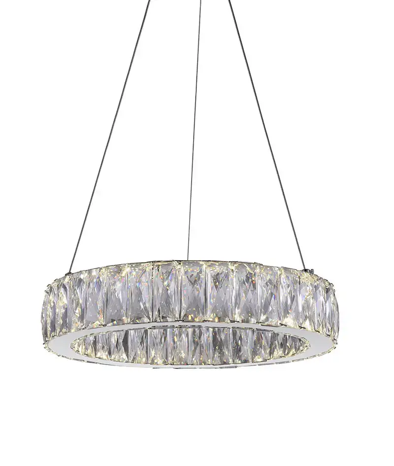 An undeniably elegant light fixture that would make a stylish addition to your living room or dining room. The Juno 3″ LED Chandelier features a 3-inch thick crystal halo with 16-inches diameter. Integrated LEDs make this light fixture cast a brilliant shine. This is a dimmer-compatible fixture so you can adjust the light brightness to set different moods.