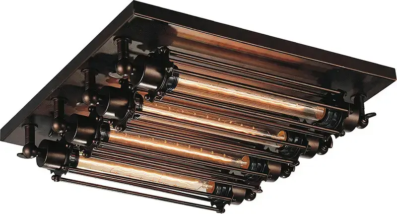 The Kiera 4-Light Flush Mount is a dark colored light source with a rustic appeal. Slender logs of light are held by a square chrome plate mounted close to ceiling. This 18-inch light fixture exudes that natural, aged, and casual vibe perfect for giving your home a glow and visual interest that’s warm and inviting. Choose between a black and a chocolate brown finish.