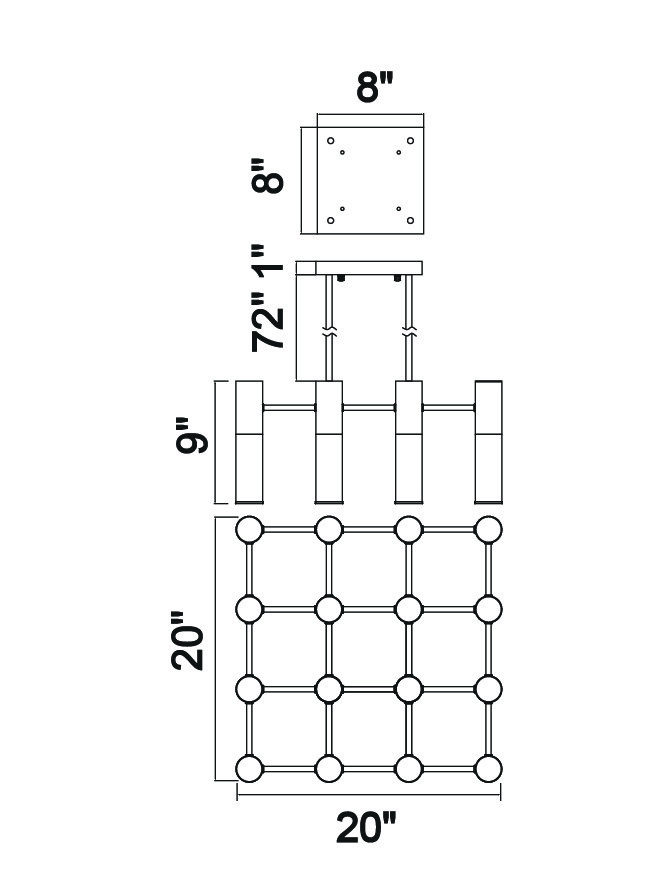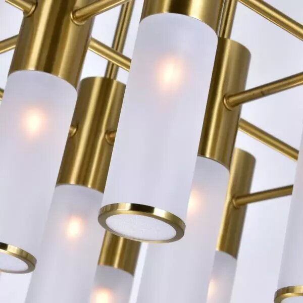 Add a chic touch to that wide, open room in your urban-industrial space with the no-frills elegance of the Pipes 16-Light 20-in Down Chandelier in Brass Finish. A square brass canopy holds four sturdy downrods that connect to a patterned panel of lights. Sixteen narrow frosted glass cylinders requiring G9 LED bulbs will provide ample illumination to your hip and contemporary home.