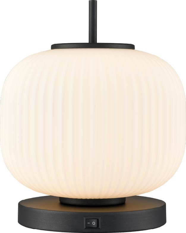 Using ribbed half-opal glass, this lamp displays a style similar to that of a paper lantern. In your home, this light will bring similar light and warmth to one of those lanterns. It can be hard-wired or plugged-in.