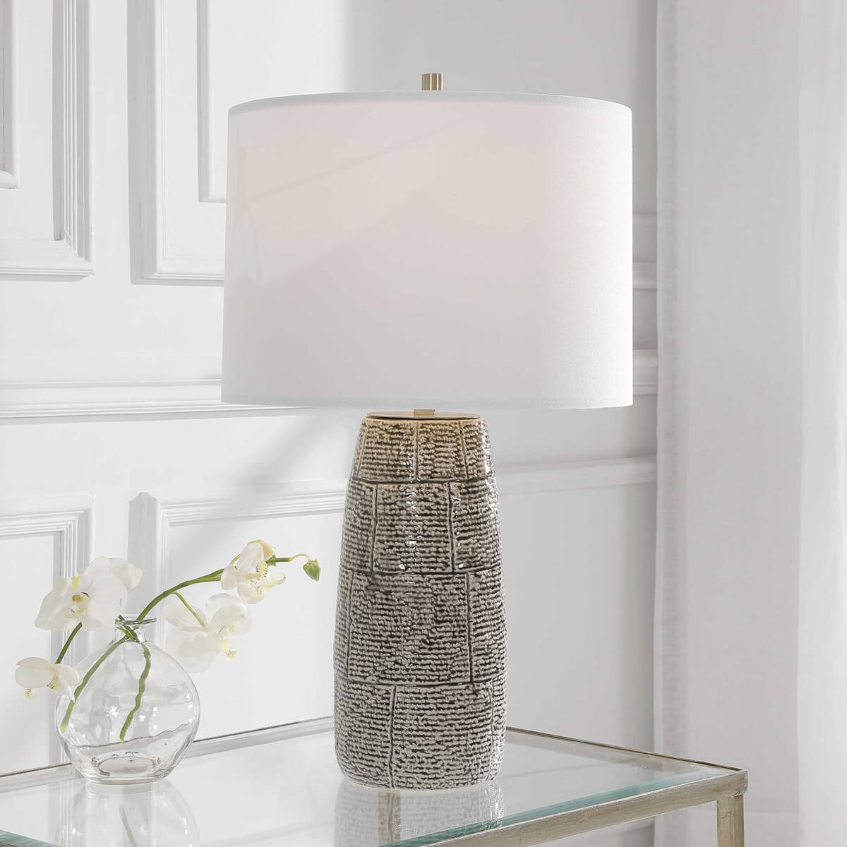 The offset brick pattern of this black and white ceramic lamp will be a focal point of any room. Brushed nickel details complement the look. The round hardback drum shade is a white linen fabric with stitching around the top and bottom. Shade requires some assembly.