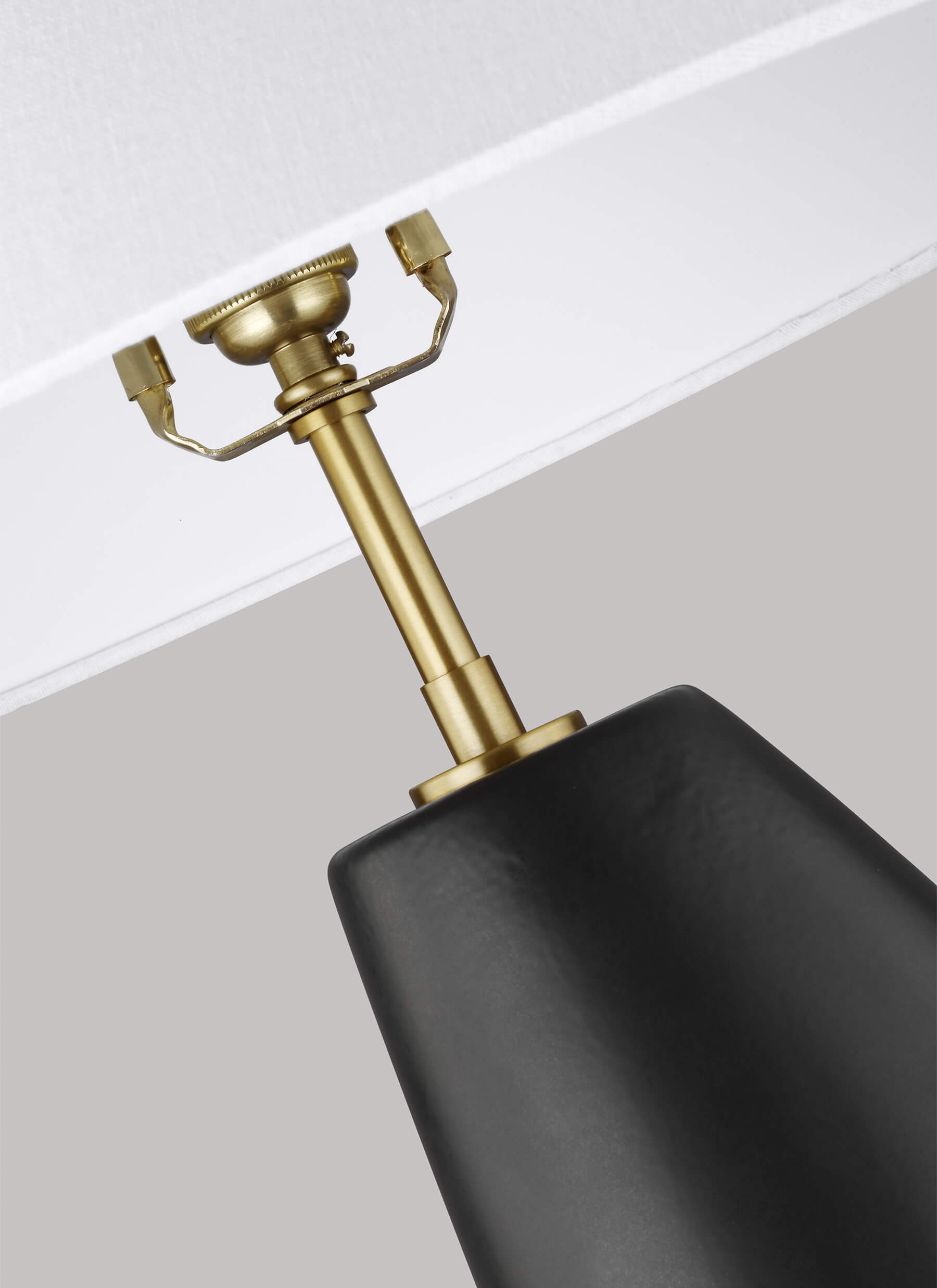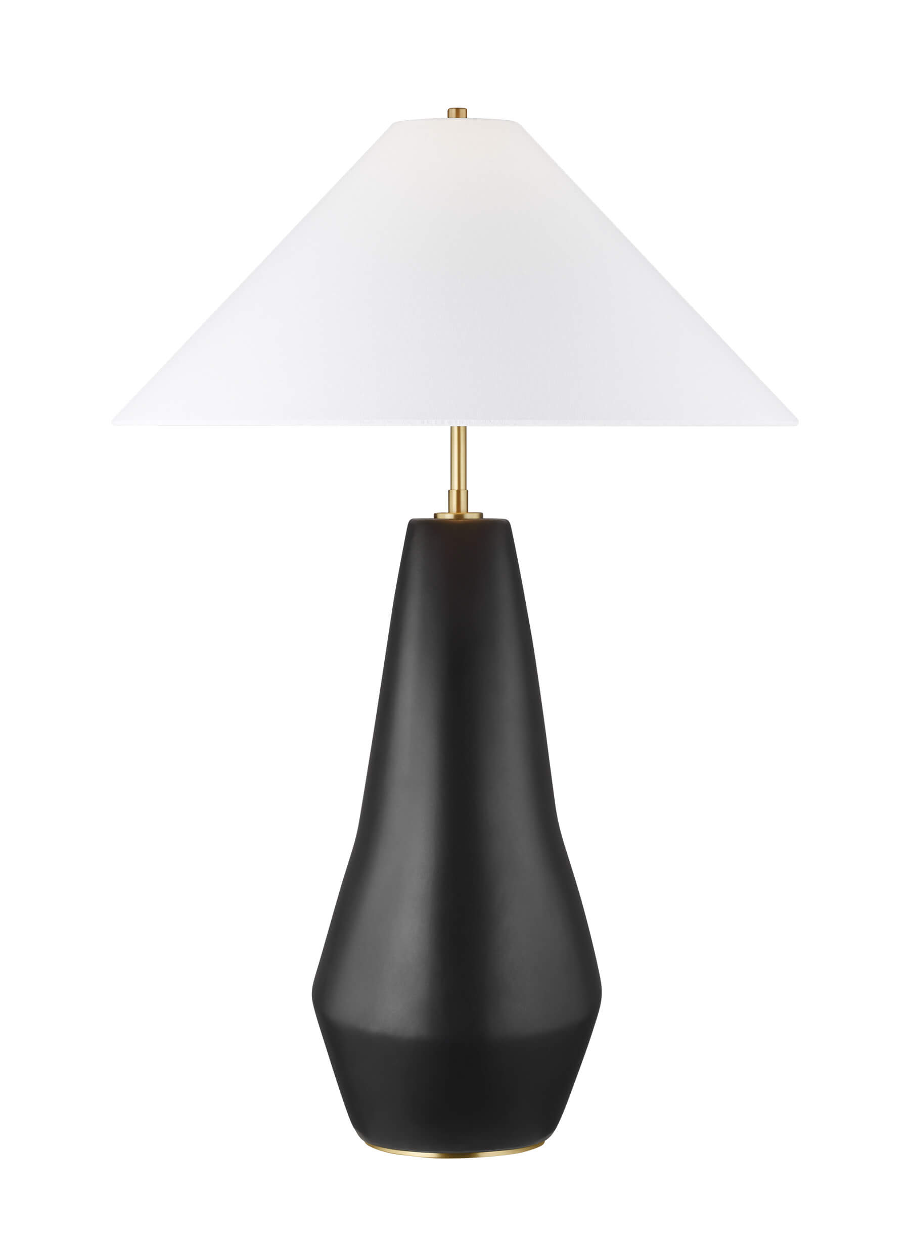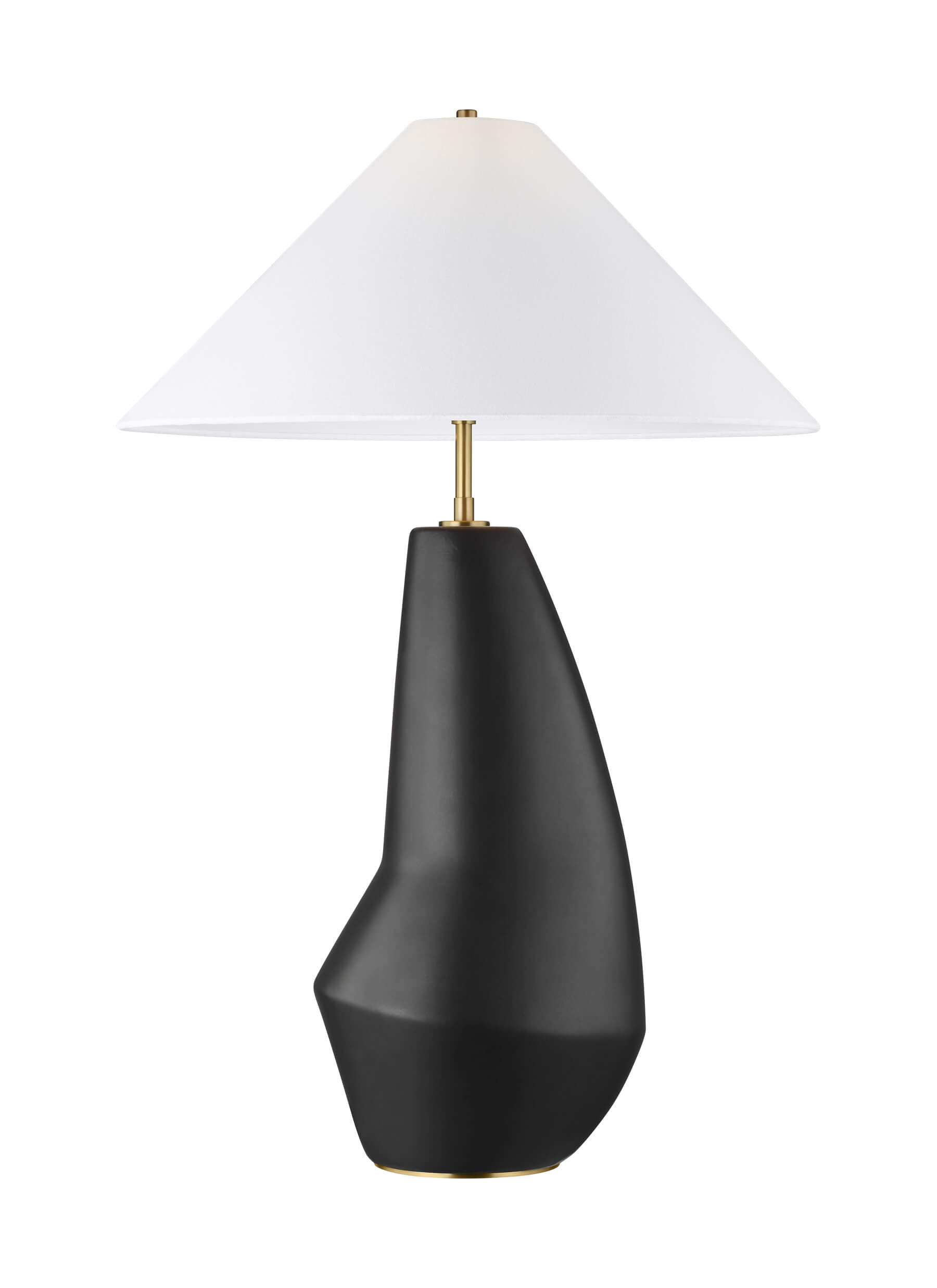 Crafted of ceramic with an organic form and matte glaze in an Artic or Coal finish. A burnished brass base and white linen shade balance this relaxed design.