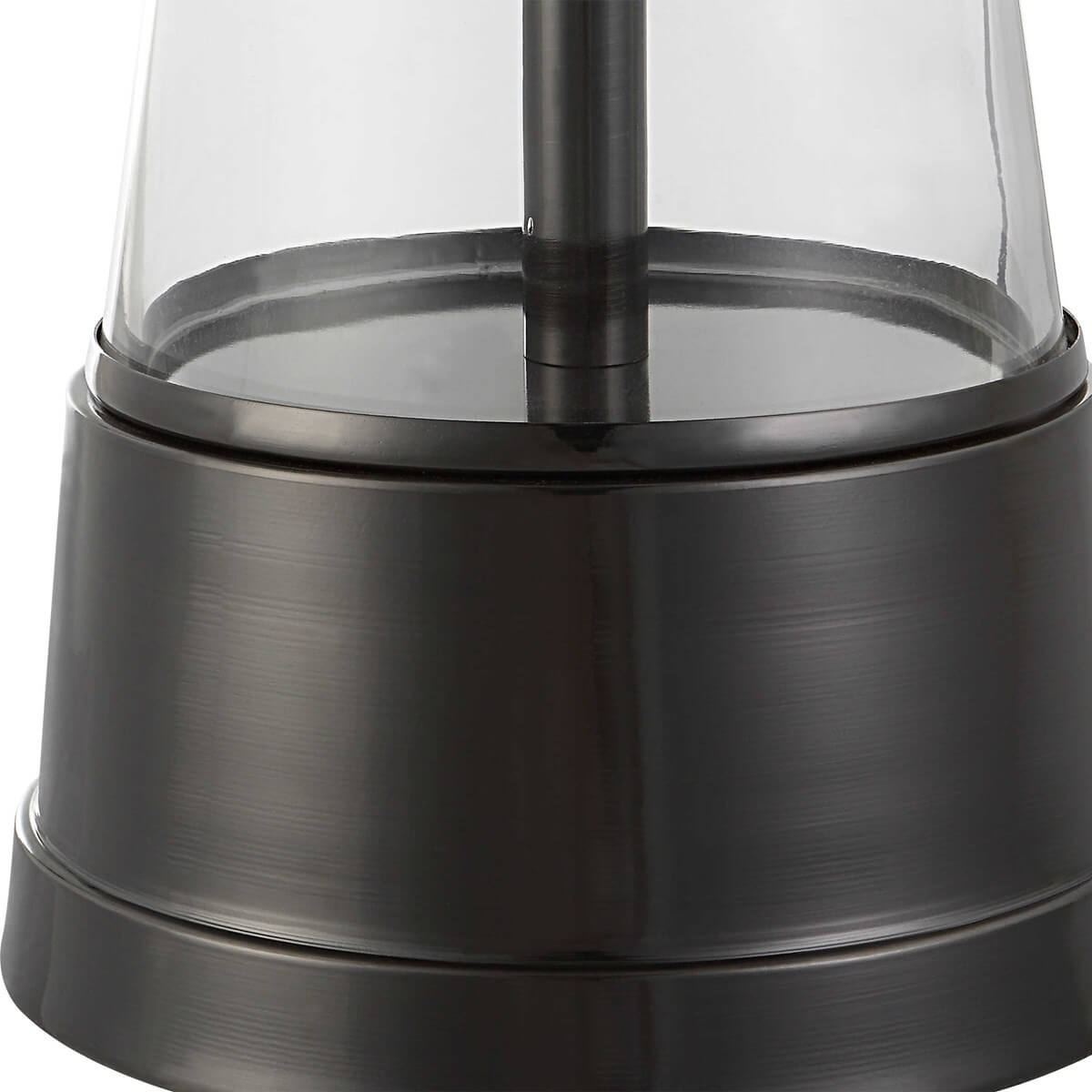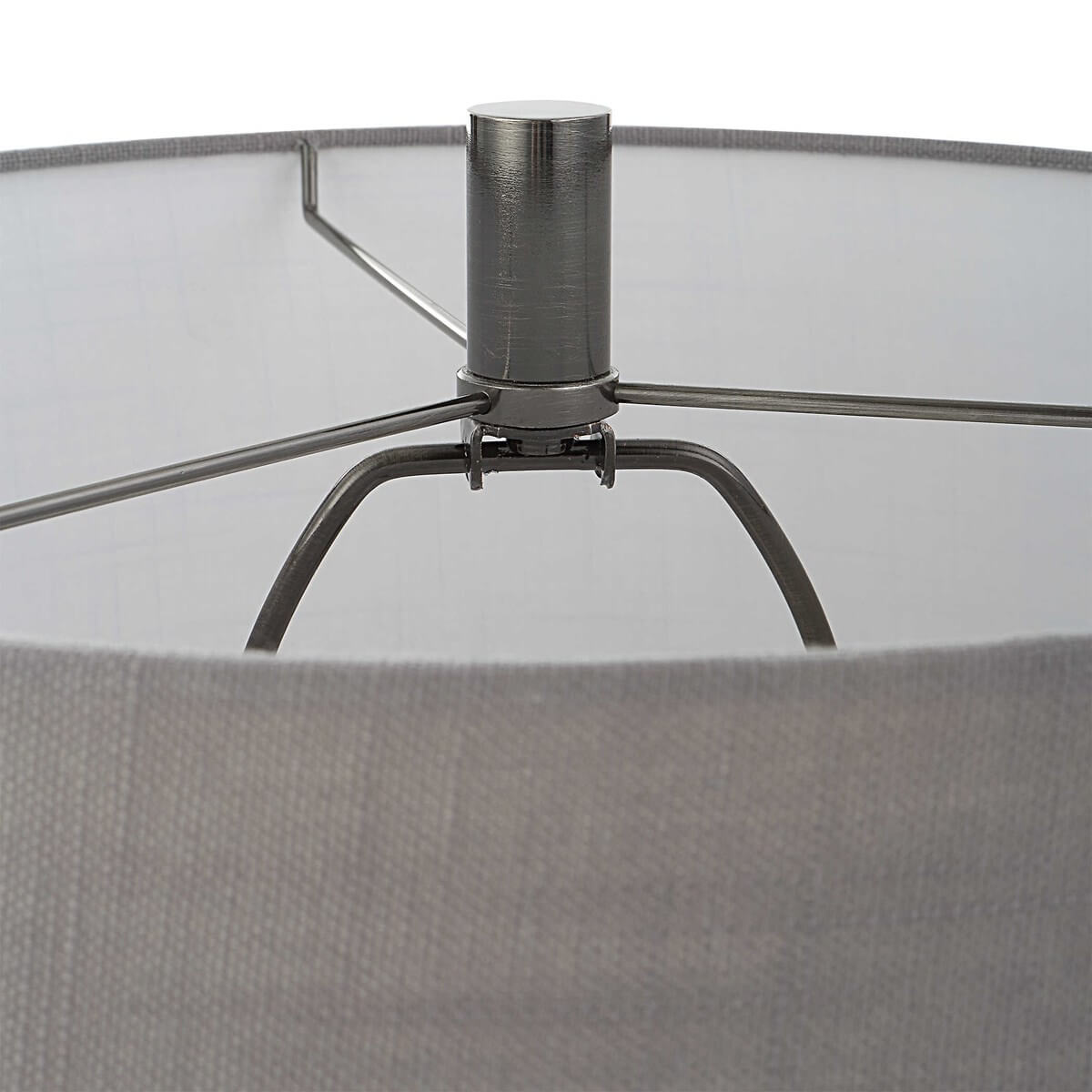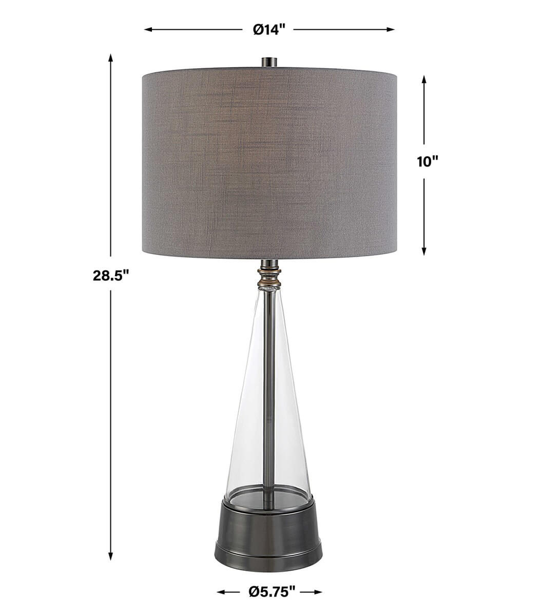 This contemporary style table lamp features a cone shaped, glass base that sits atop an antique dark nickel metal foot. The 14" round, hardback shade is a gray linen fabric with light slubbing.