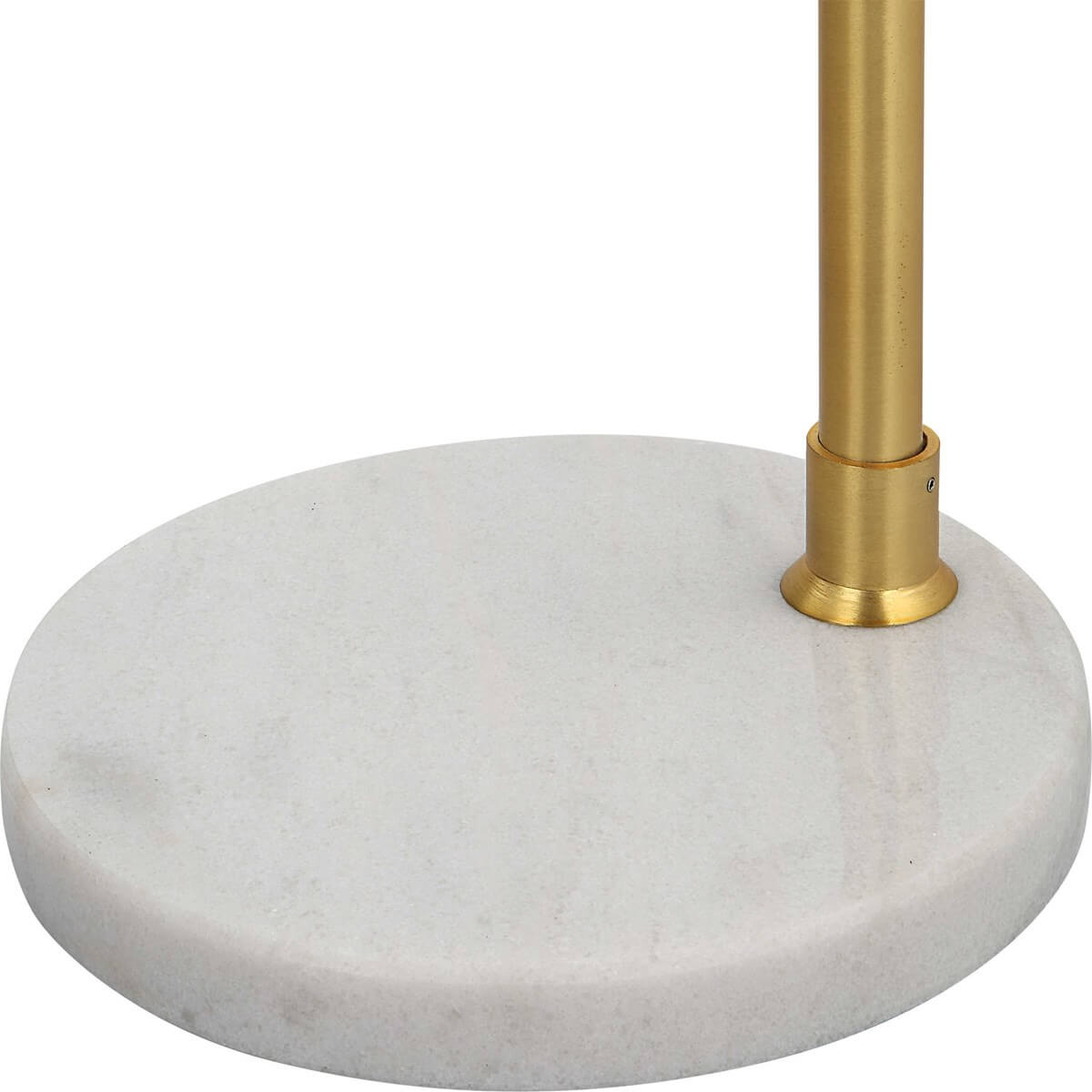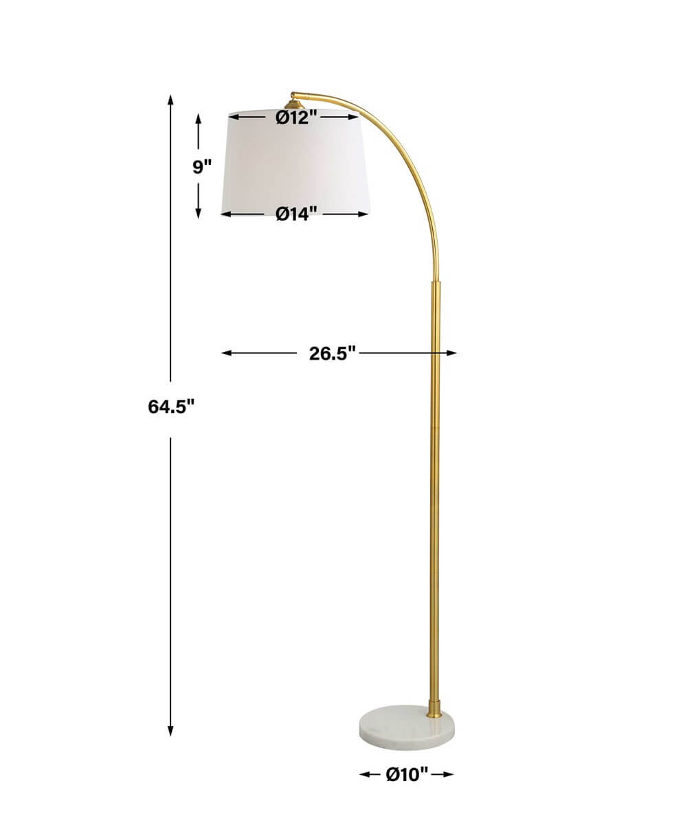 This contemporary style metal arc floor lamp is finished in gold, and is anchored with a thick white marble base. The tapered white linen shade can be adjusted to shine light where needed.