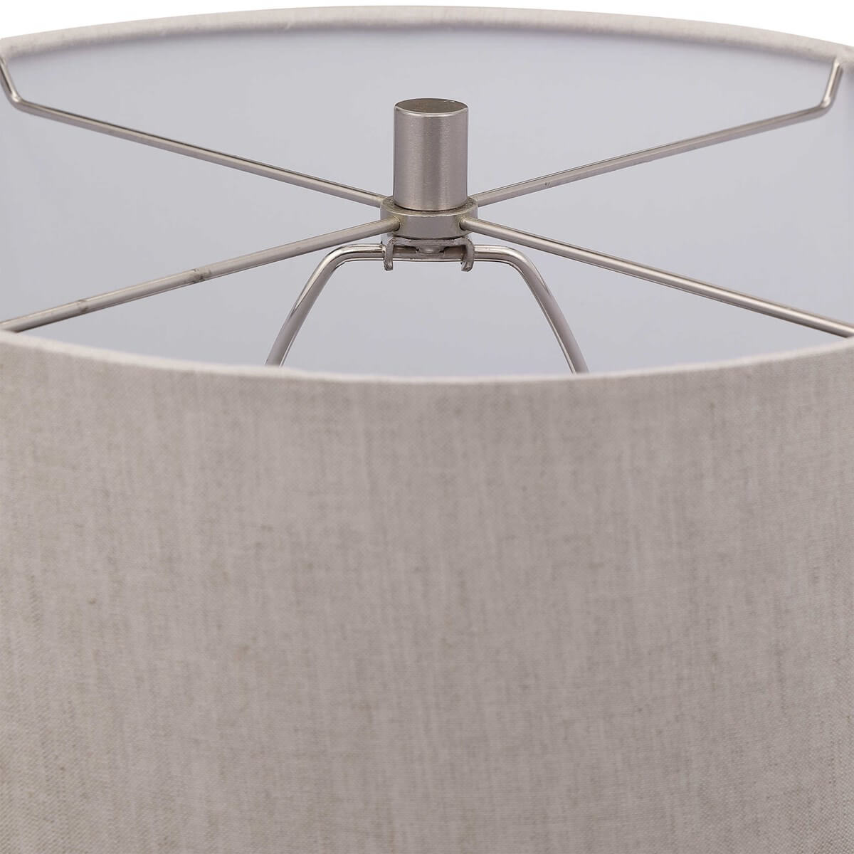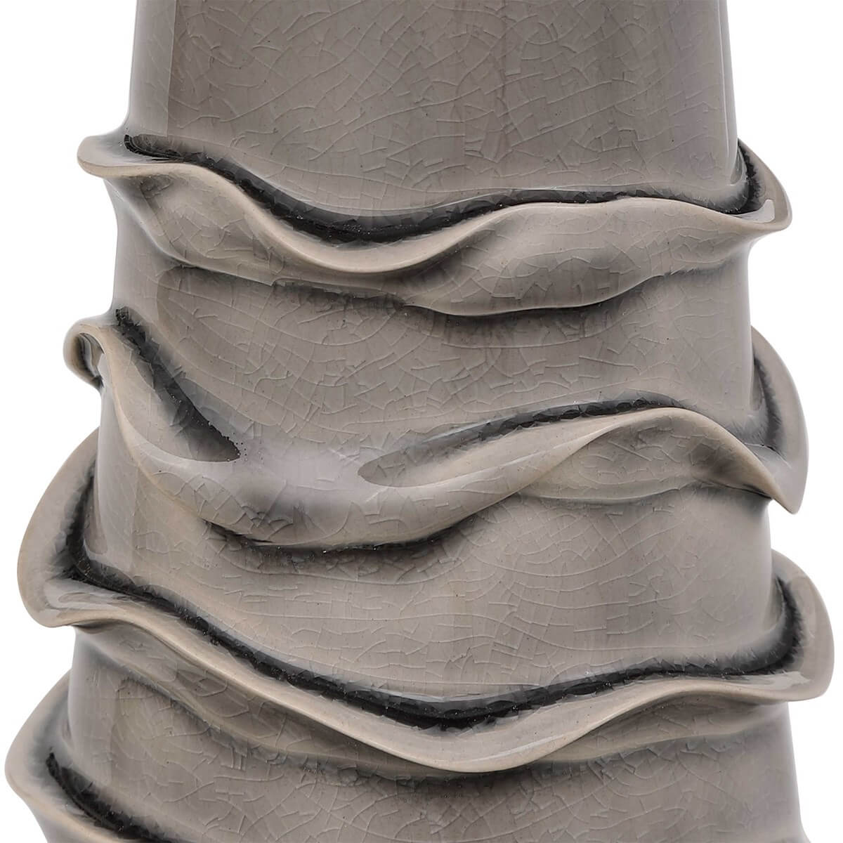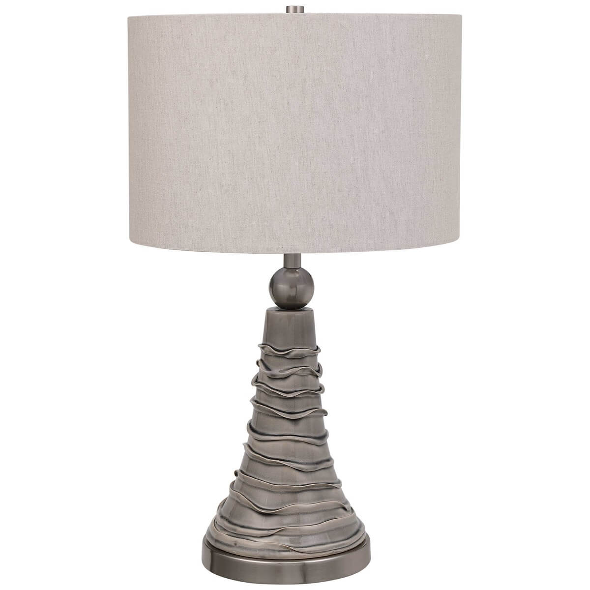 This dove gray ceramic table lamp features uneven, wavy lines that give uniqueness to this piece. The round hardback drum shade is a light gray linen fabric. Shade requires some assembly. Due to the nature of fired glazes on ceramic lamps, finishes will vary slightly.
