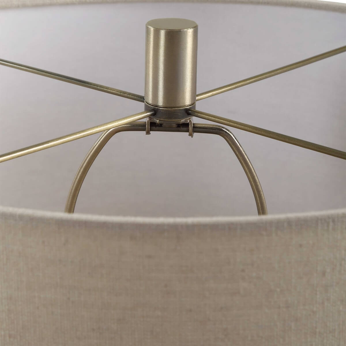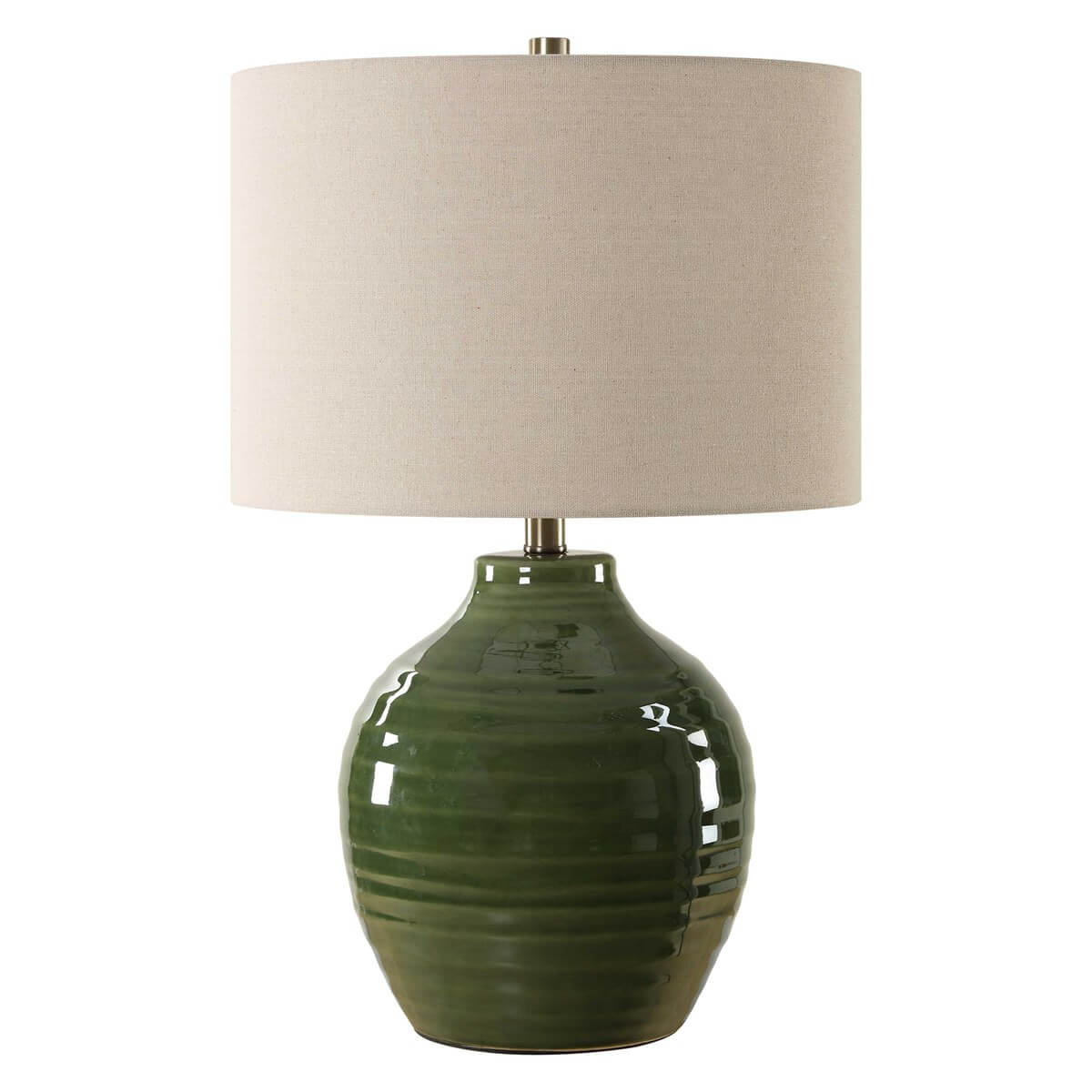 The textured body of this ceramic lamp is enhanced with a rich moss green glaze. Antique brass details complement the finish. The round hardback shade is a beige linen with light slubbing.