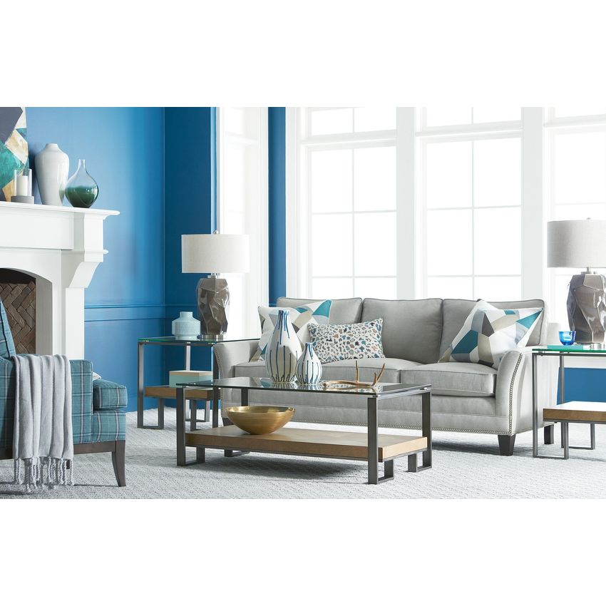 Rectangular end table has a shelf and tempered glass top that lends towards contemporary, Metal tubing base and a thick quartered oak veneer shelf is perfect to finish off any setting.