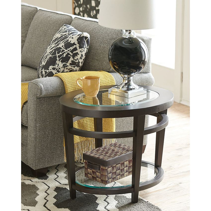Oval end table is crafted of hardwood solids and quartered oak veneers with tempered glass inserts in a dark oak finish. It is both urban chic and suburban practical with the alluring lines and tempered glass shelf on the bottom for display.