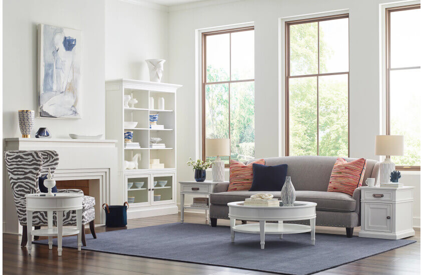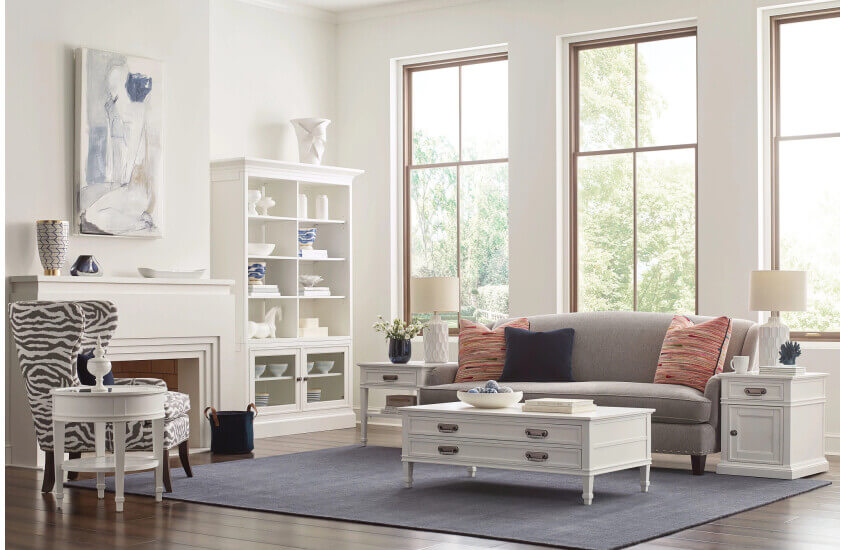 Structures collection offers a unique built-in look for creating a bookcase, entertainment wall, or other living room cabinetry. Complimentary occasional tables in a Sherwin Williams’ best-selling Pure White finish adorn these transitional forms withe tapered legs and simple yet refined details and thoughtful storage and functionality.