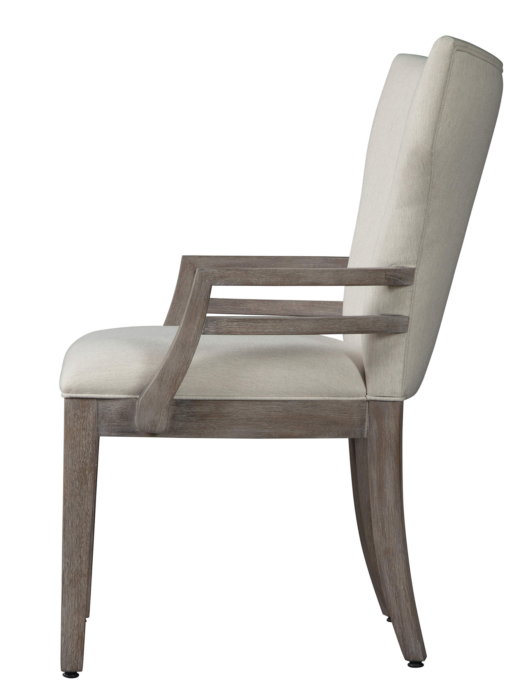 A gracefully shaped upholstered back with arm detailed with a single stretcher underneath for a contemporary touch.