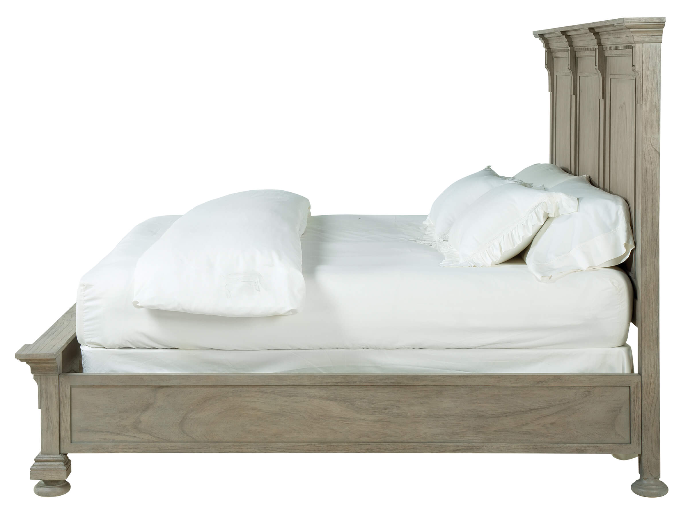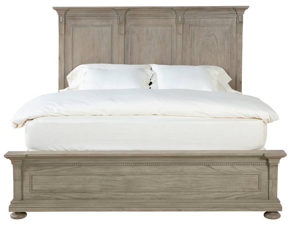 Break front headboard top with flat posts and corbels and three overlay molded panels.
