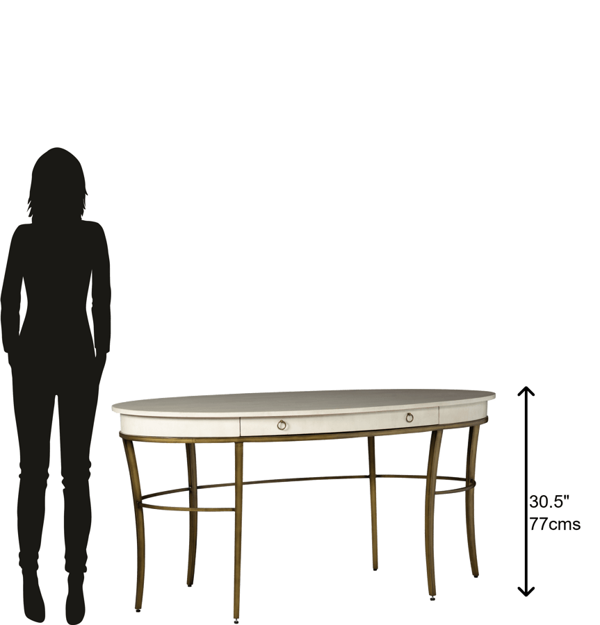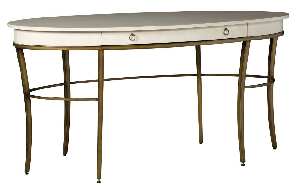 Oval writing desk comprised of mahogany veneers and solids with six metal saber legs and oval stretcher forming the base.