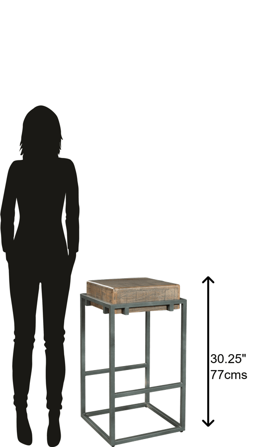 Pub stool consists of a solid acacia box cradled in an iron leg frame.