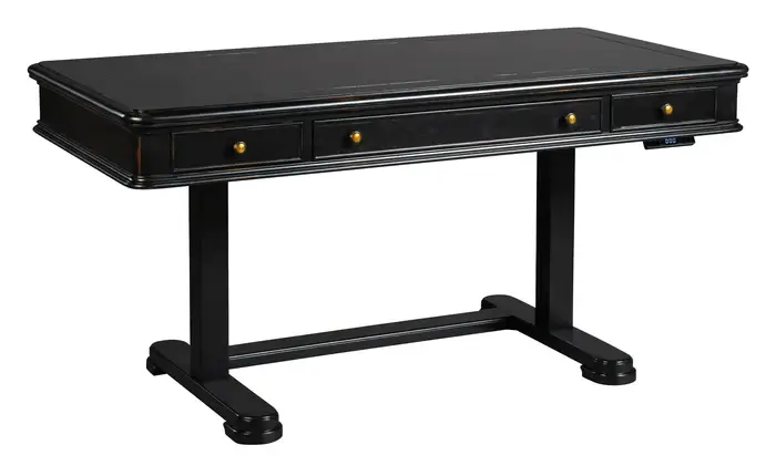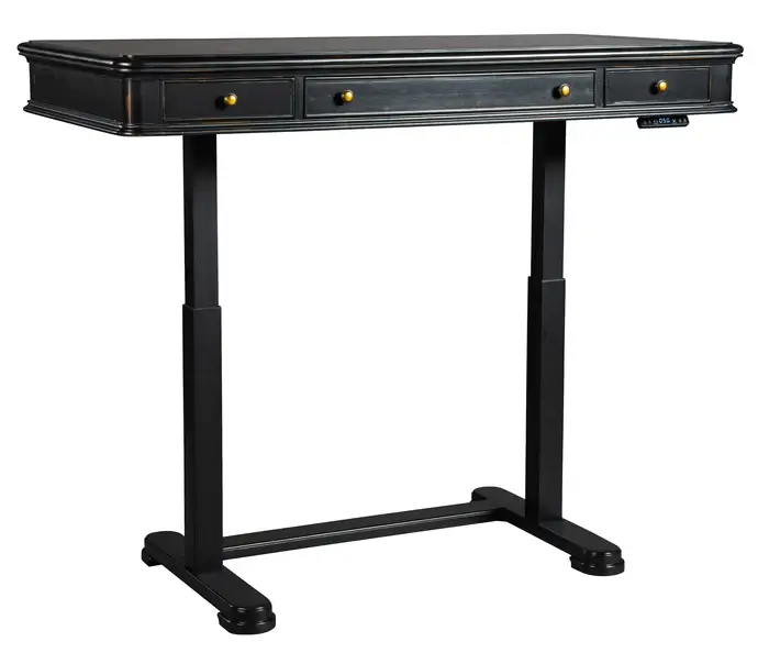 - The desk is mounted on black finished metal legs with an electric lift; wood stretcher and feet.