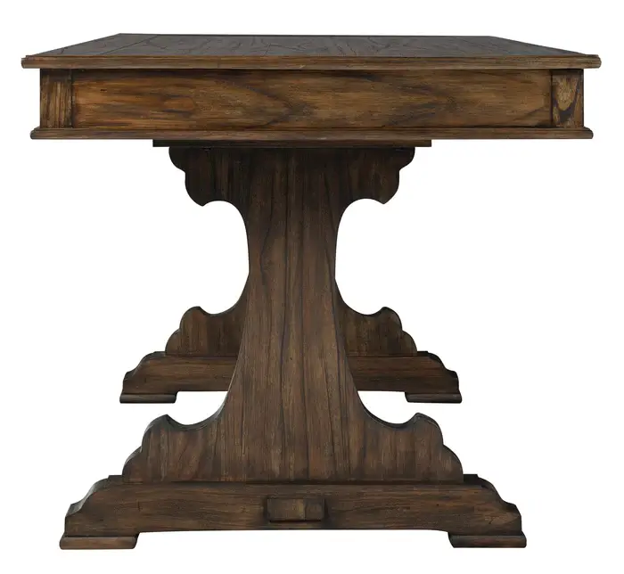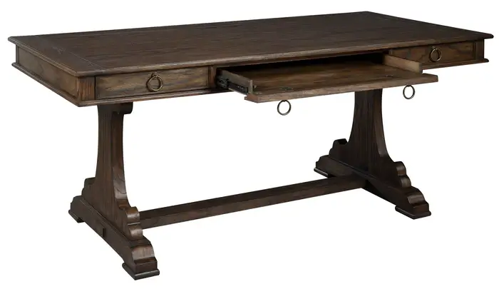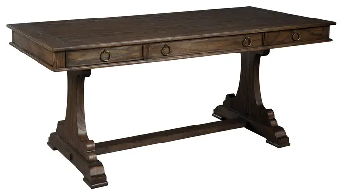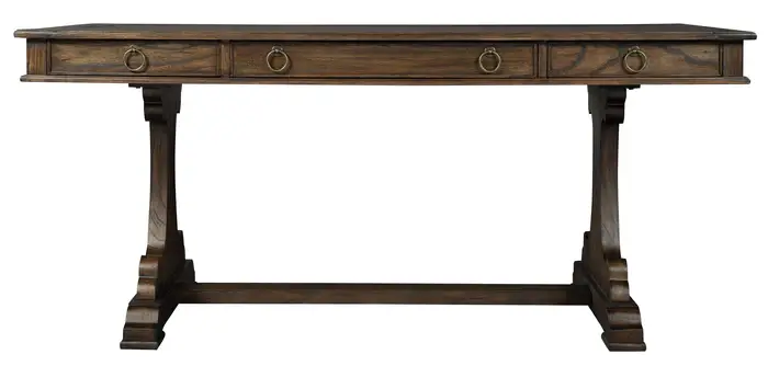 - This writing desk has shaped end panel supports with a stretcher base and three drawers with a center drop-down drawer face for tablet and laptop storage.