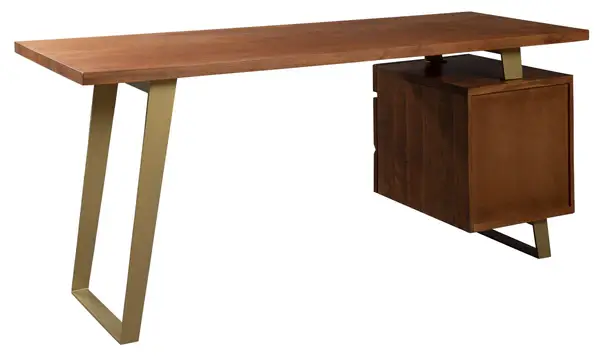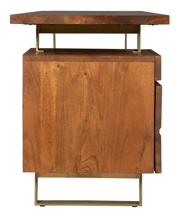 - This desk has a top of solid Acacia wood with solid iron legs in brass finish with file and box drawer mounted to the side legs
