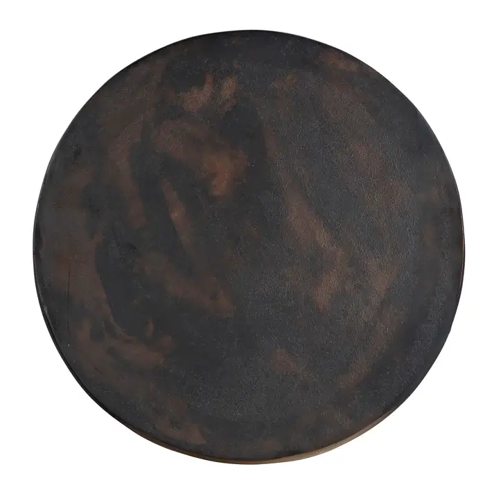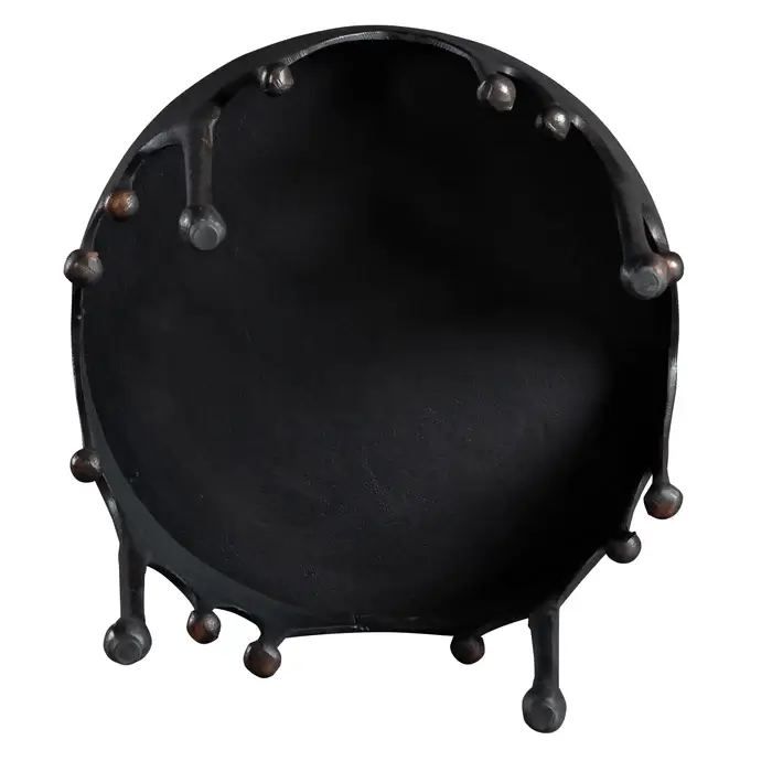 - Cast metal side table with a whimsical design appearing as poured metal dripping off a round table.