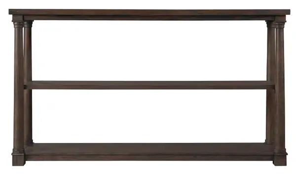 - This sofa table has three shelves supported by tapered posts with collars.