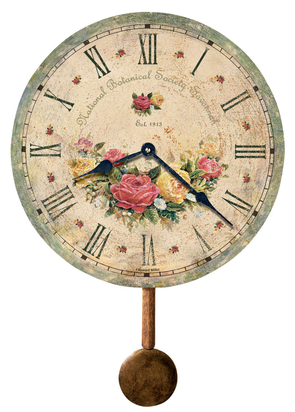 Antique-Inspired Style: This round wooden clock is adorned with abundant pink and yellow roses. A cursive script that reads National Botanical Society Savannah is emblazoned across the upper portion, and tiny rosebuds separate the black Roman numerals. The hour and minute hands have an antiqued black finish to match the numerals.