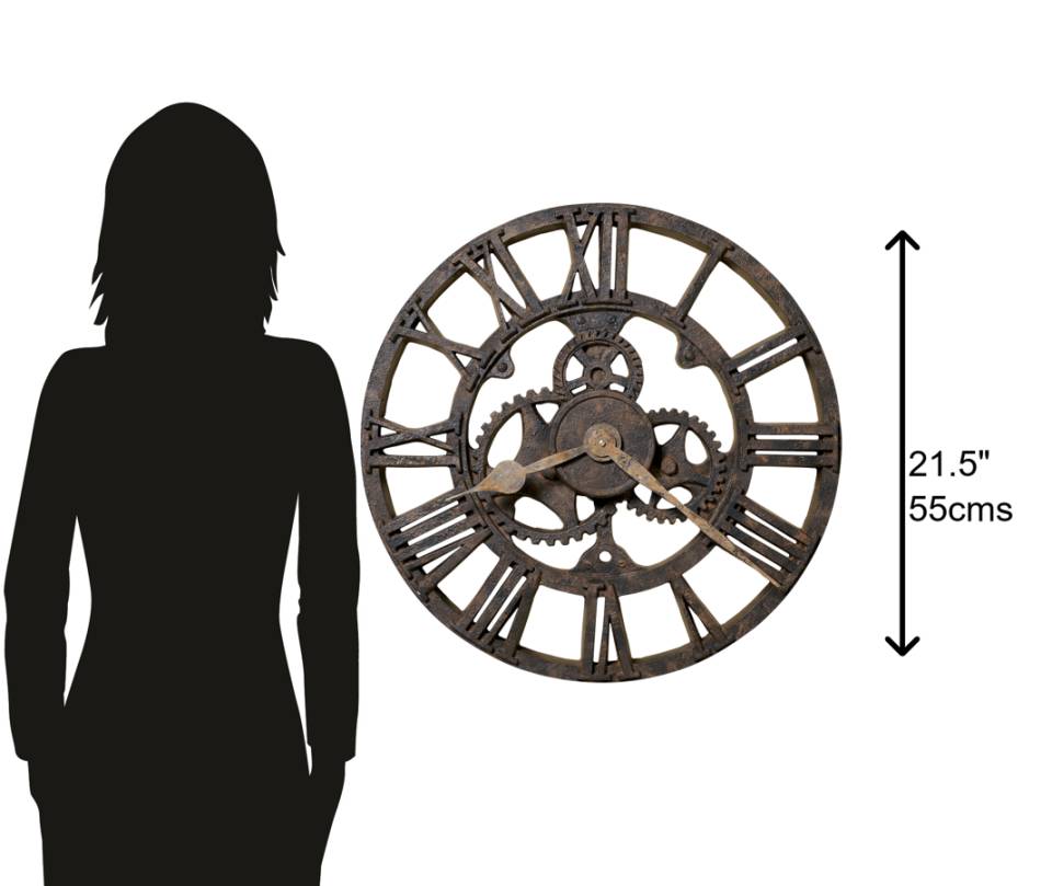 Rusted Finish: The rusted finish on this round wall clock has the look of a fine antique. The visible gear assembly and Roman numerals further enhance the aged appearance of this large wall clock. The hour and minute hands also have an antique finish for a complementary look.